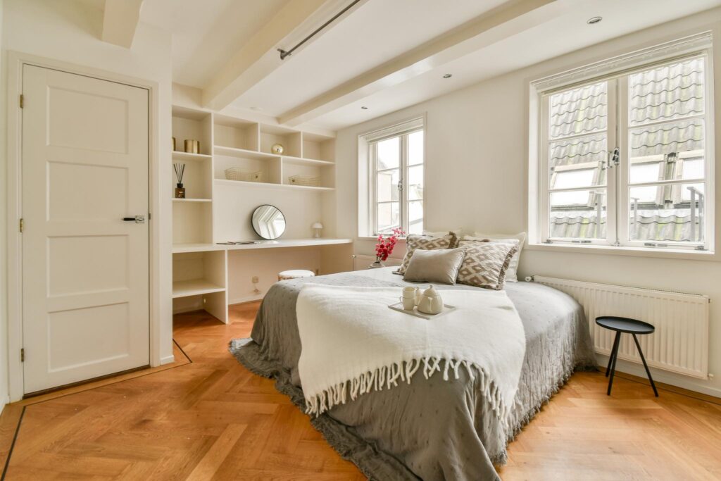 De ruime lichte slaapkamer met walk-in closet én opmaat gemaakte study/kaptafel is gelegen aan de achterzijde van de woning, hoewel u midden in het Centrum woont, is daar in deze rustige en stille kamer niets meer van te merken en kunt u heerlijk van uw nachtrust genieten.
