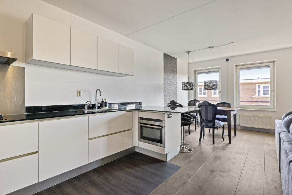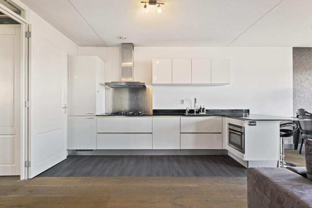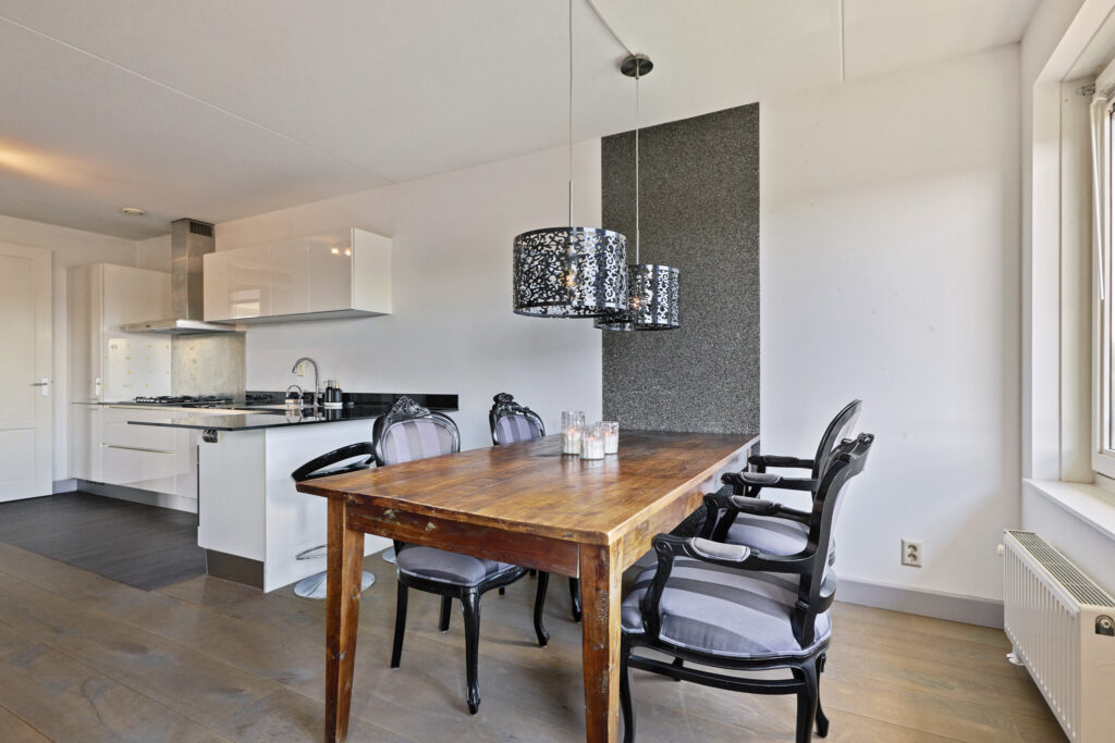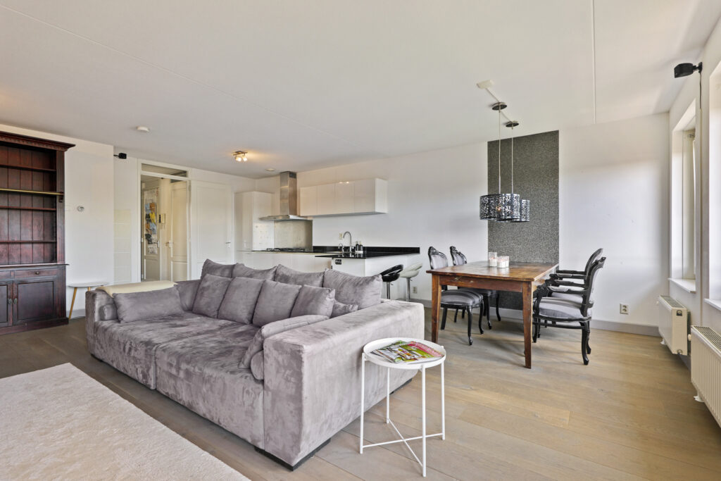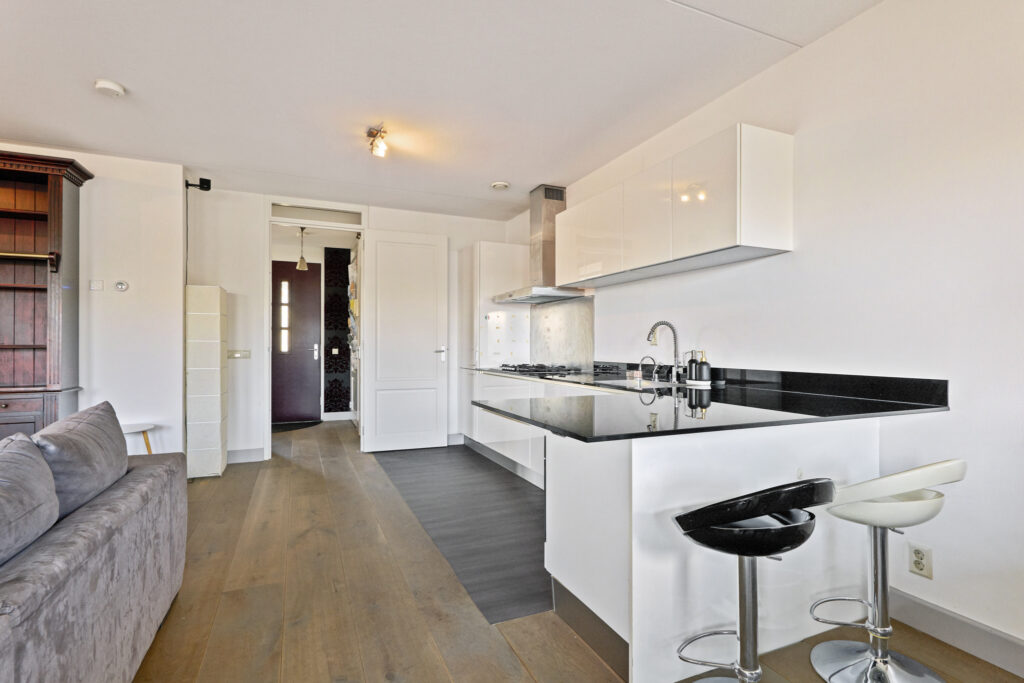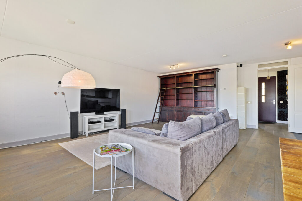 Vanuit de hall komt u in de lichte en ruime living met fraaie zeer kwalitatieve houten vloer en open keuken. De keuken is volledig uitgerust met een IJs met vriescombinatie, afwasmachine, oven/magnetron combinatie, Quooker en een gasfornuis. De royale living biedt diverse indelingsmogelijkheden, en dankzij de vier grote ramen geniet u in deze ruimte van optimale lichtinval.