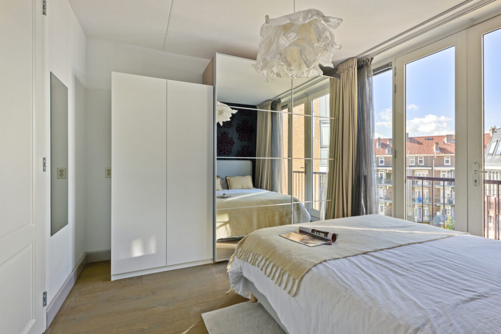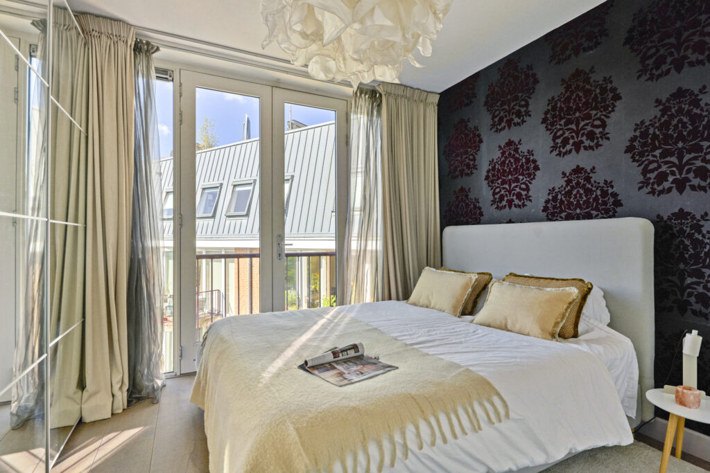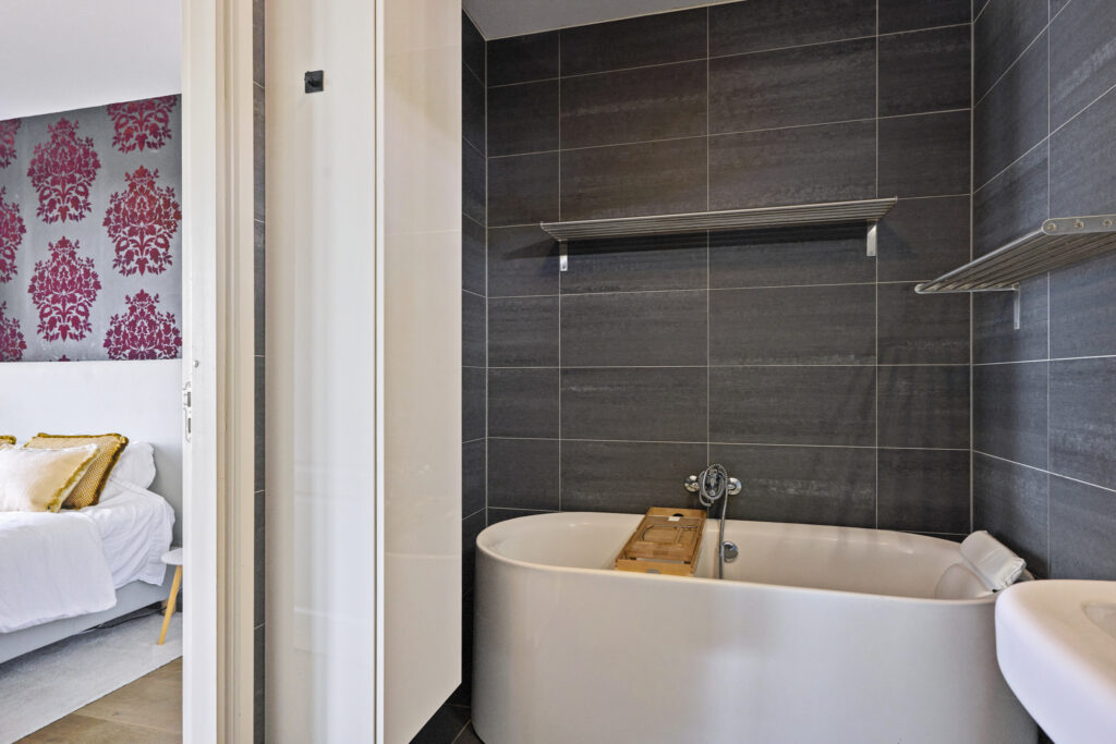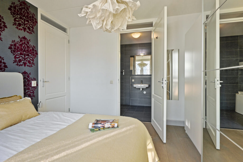 Aangrenzend bevindt zich de ruime slaapkamer met badkamer en-suite. De slaapkamer beschikt over openslaande deuren naar een Frans balkon. De moderne badkamer is voorzien van een ligbad, inloopdouche, wastafel en een tweede toilet.