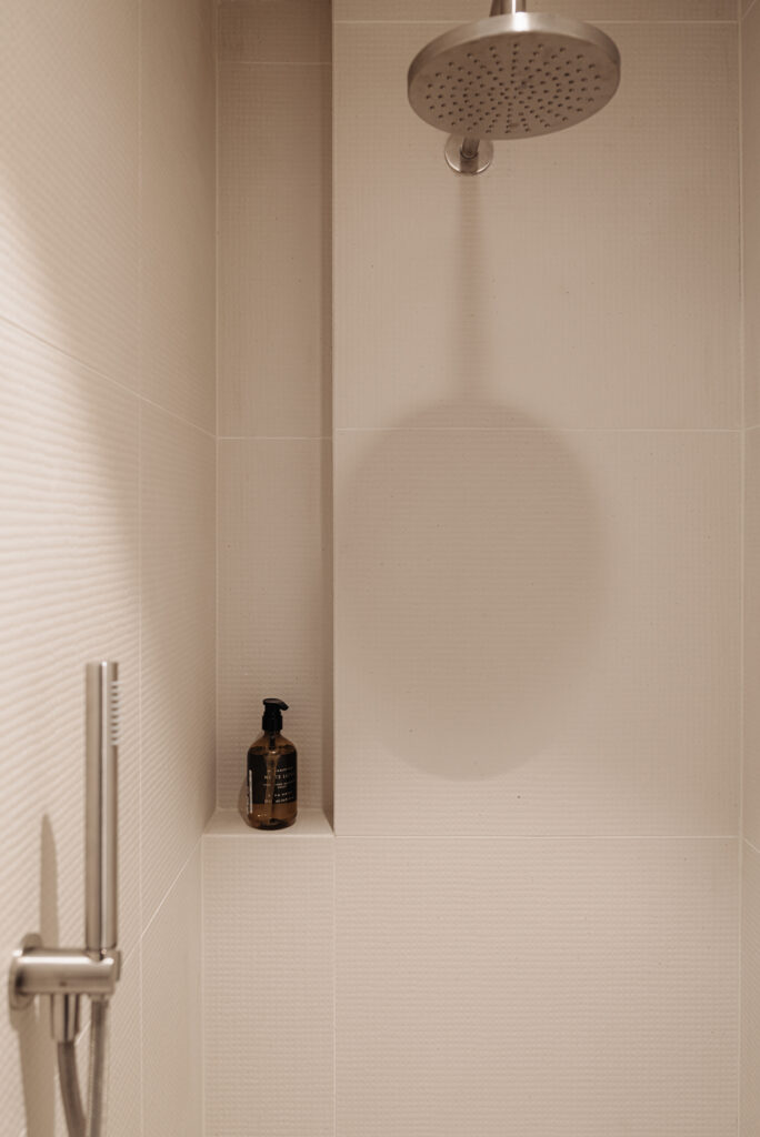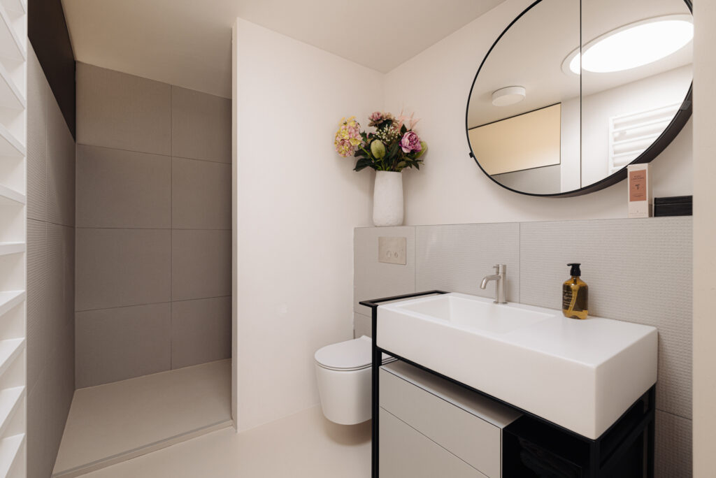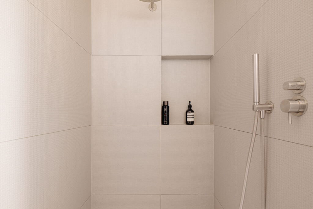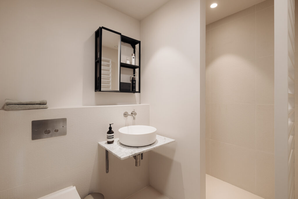 Hier is de eerste ruime slaapkamer met extra bergruimte en vrij uitzicht over het water. Deze kamer heeft beschikking over een eigen badkamer met royale inloopdouche, wastafelmeubel en toilet.