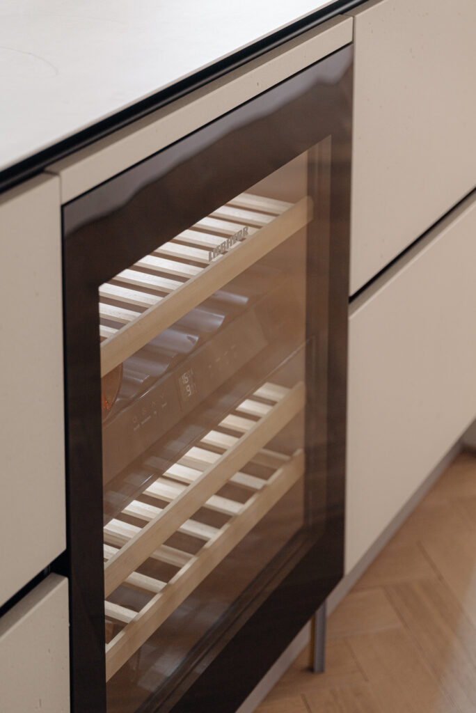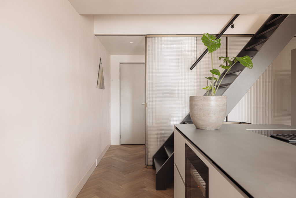 Aan de voorzijde bevindt zich de met licht overgoten living met een plafond van maar liefst 3,98 meter. Vanuit de living is er directe toegang tot het riante zonnige terras op het Zuiden, met waanzinnig uitzicht op het water. Aan de achterzijde treft u de moderne open keuken, met kookeiland, welke voorzien is van alle moderne inbouwapparatuur o.a. oven, wijnklimaatkast. Tevens is er een bijkeuken, welke momenteel als laundry dient en dus de aansluitingen voor de wasmachine en droger aanwezig zijn.