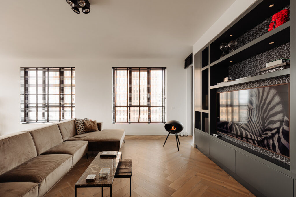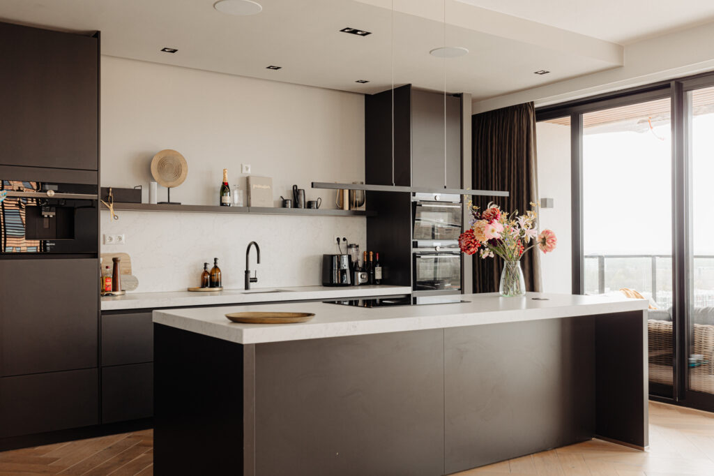 Through the hall you have access to the tasteful living room and charming kitchen. The living room is very spacious with windows all around to ceiling height with panoramic views and provides access through sliding doors to the spacious terrace, which provides a wide view of Buitenveldert and Amstelveen. The beautiful luxurious open kitchen with cooking island has marble kitchen tops and is equipped with all conceivable built-in appliances: (steam) oven, built-in coffee machine, Quooker, warming drawer, double refrigerator, dishwasher and a hob with extractor.