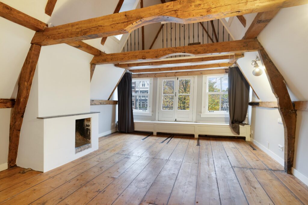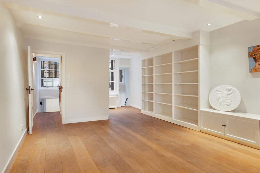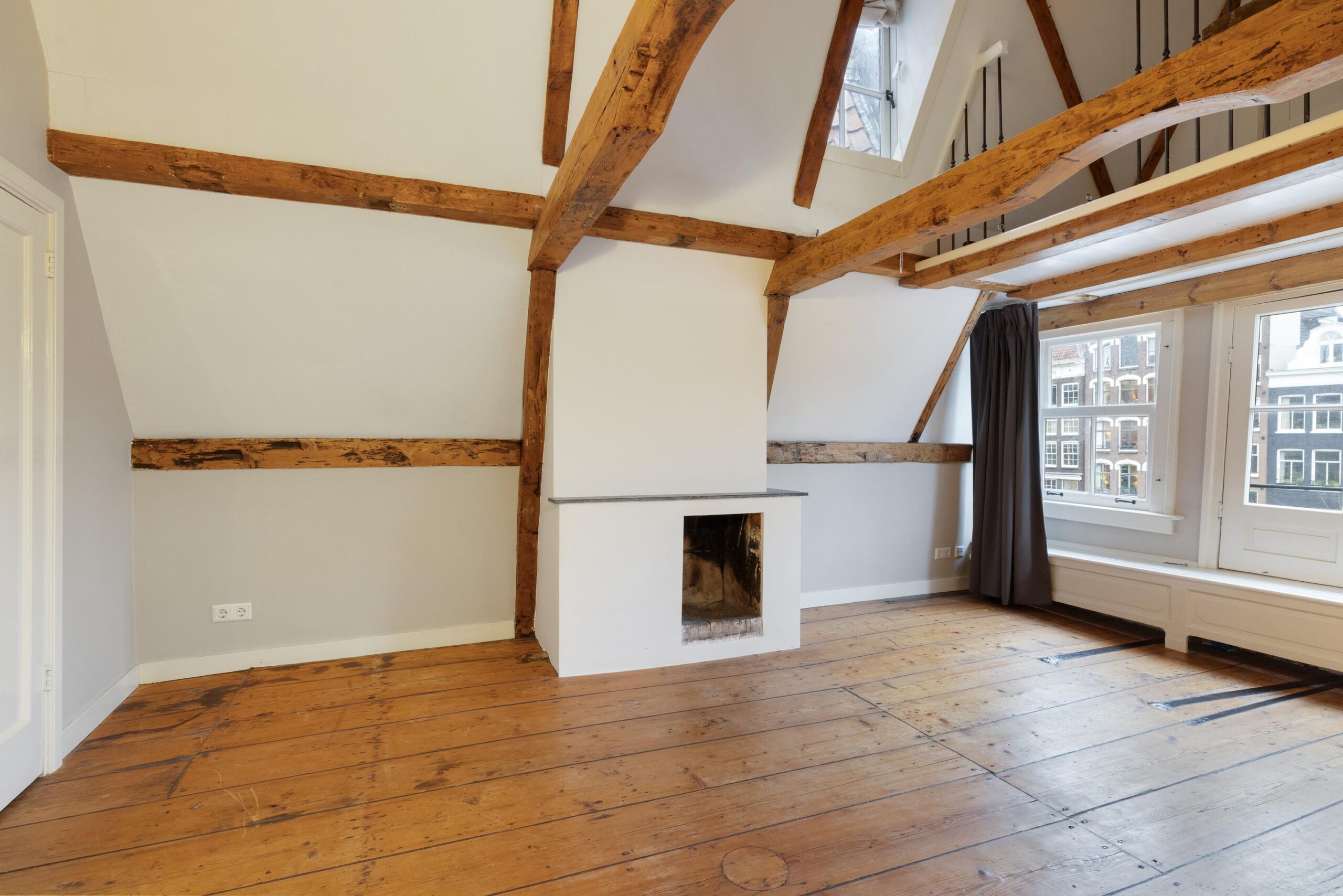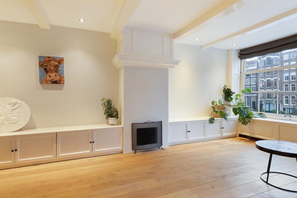 De sfeervolle living, twee ramen breed, biedt eveneens een panoramisch zicht over de Herengracht en Blauwburgwal. Authentieke details zoals het balkenplafond, maatwerk kasten en een open haard zorgen voor een warme uitstraling. Separaat gastentoilet aanwezig.
