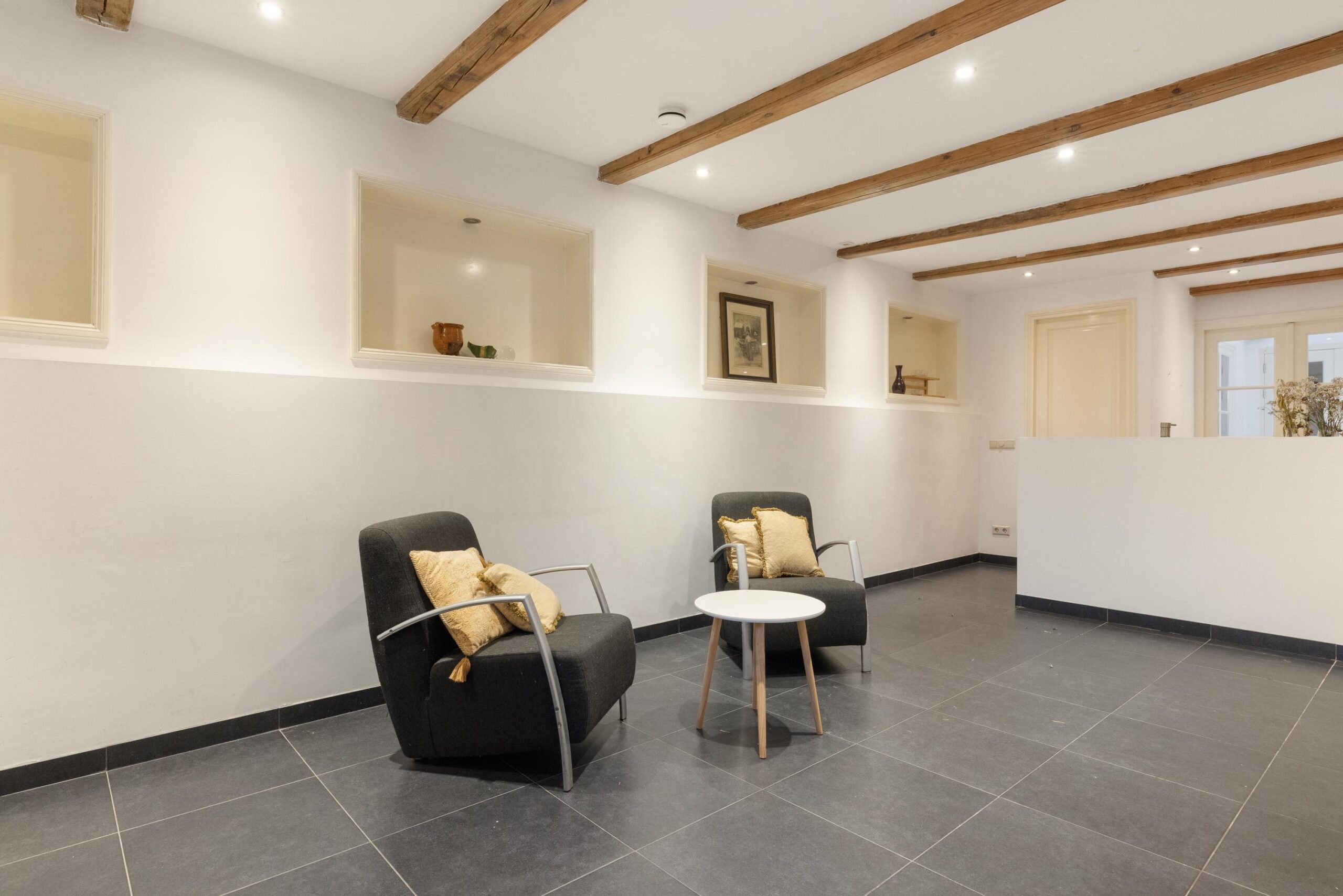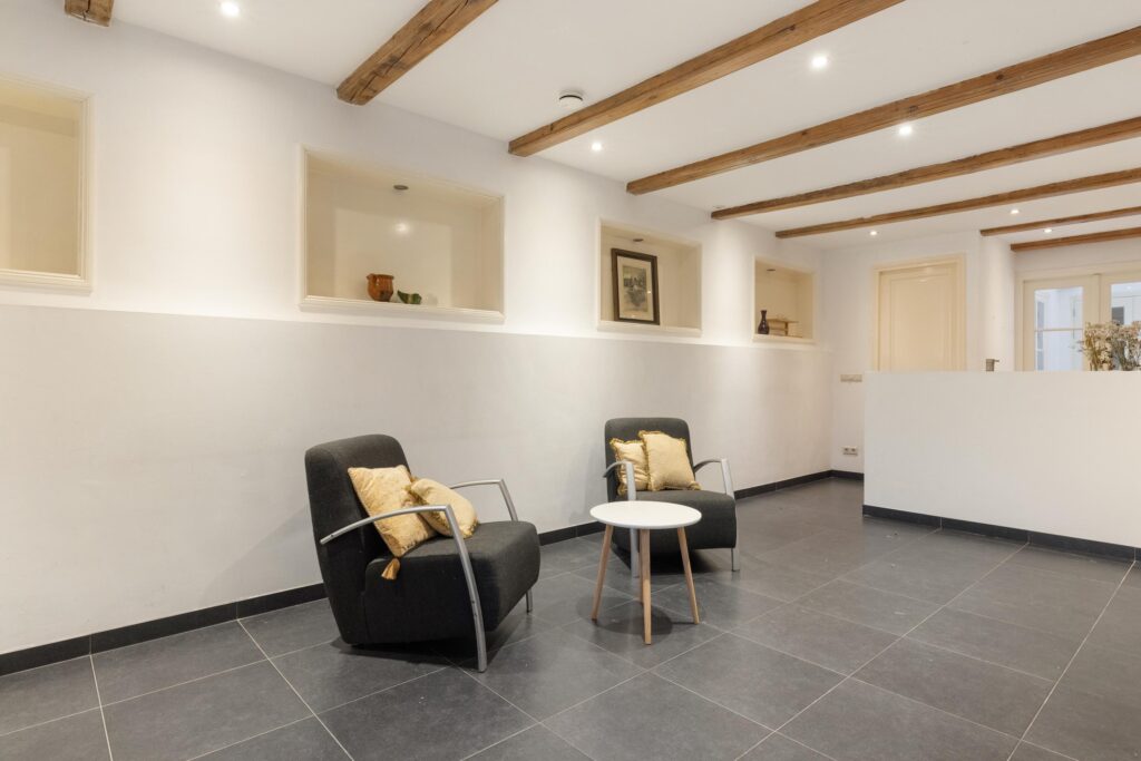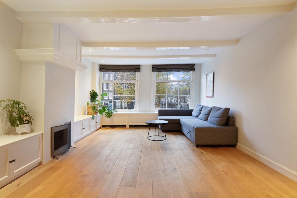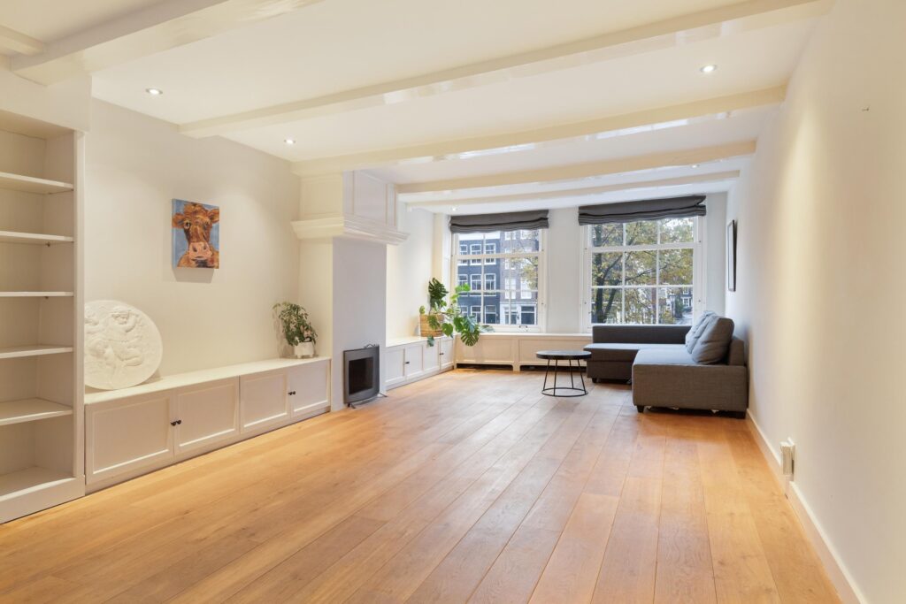 De sfeervolle living, twee ramen breed, biedt eveneens een panoramisch zicht over de Herengracht en Blauwburgwal. Authentieke details zoals het balkenplafond, maatwerk kasten en een open haard zorgen voor een warme uitstraling. Separaat gastentoilet aanwezig.