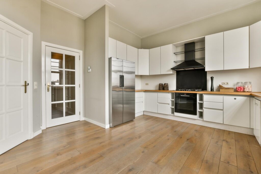 De woonkamer is verbonden met glazen schuifdeuren met de gezellige eetkamer, waarnaast zich de keuken bevindt. Het betreft een grote woonkeuken, voorzien van diverse moderne inbouwapparatuur en voldoende bergruimte. Deze woonkeuken is ook vanuit de hall bereikbaar door middel van een gang, waar u ook de gastentoilet, garderobe, bijkeuken met wasruimte, en technische ruimte treft.