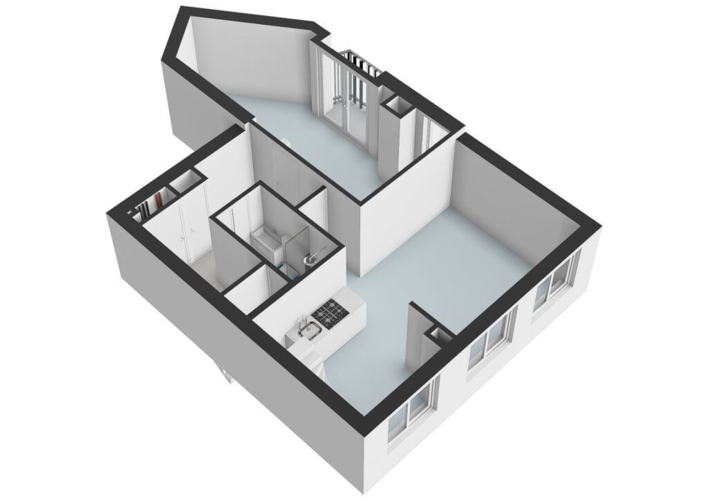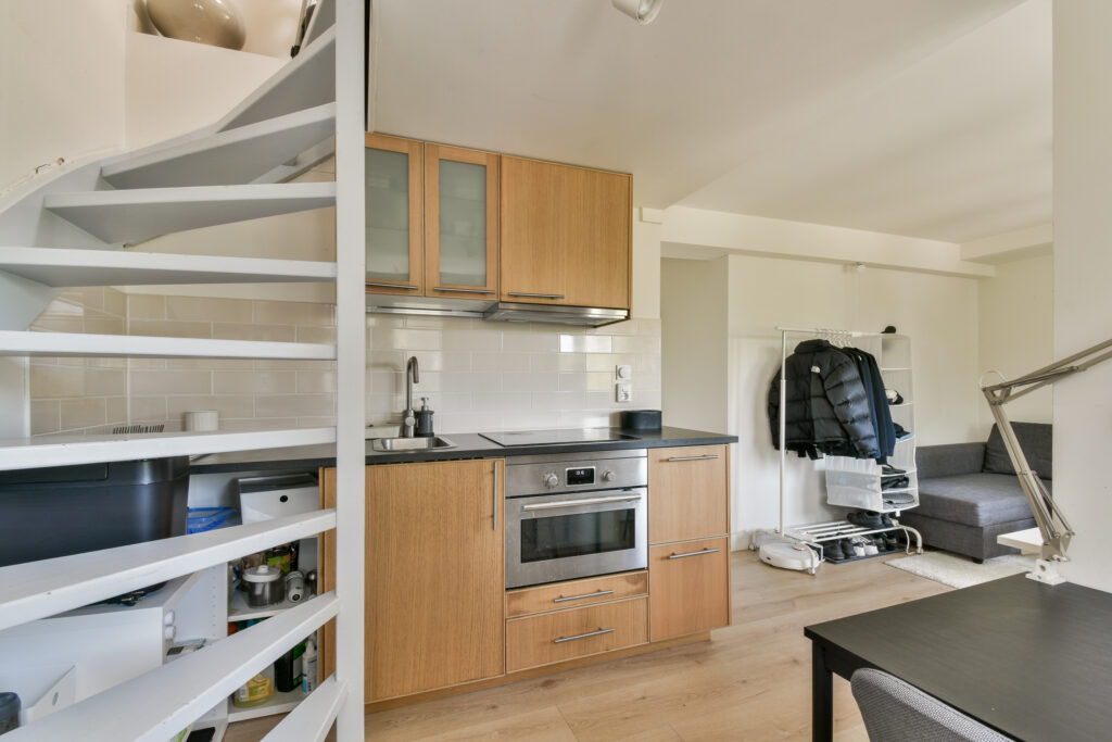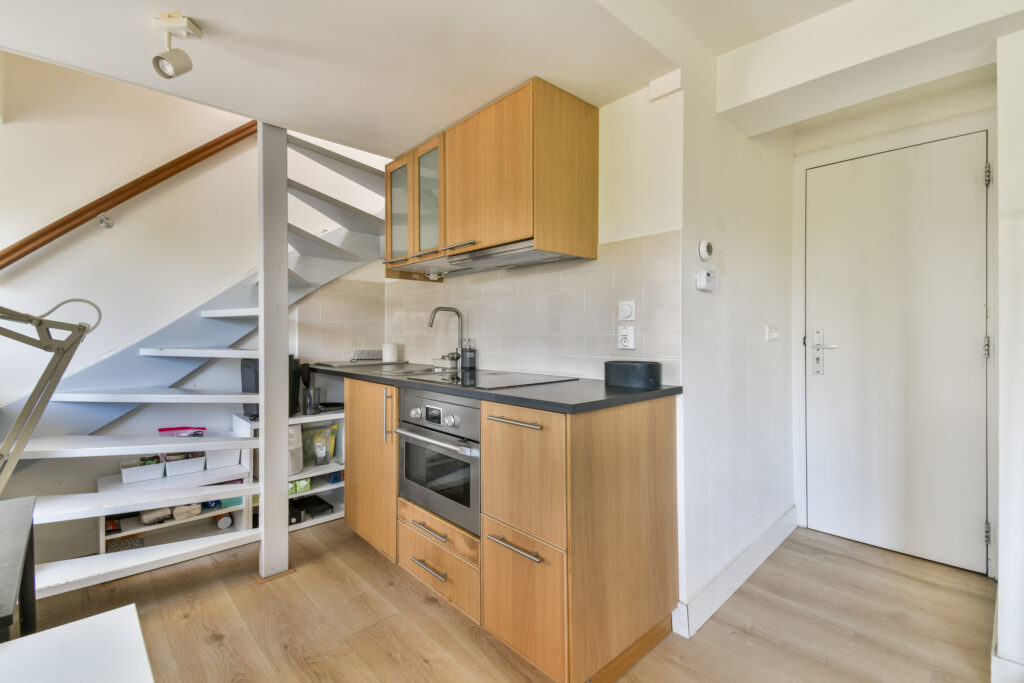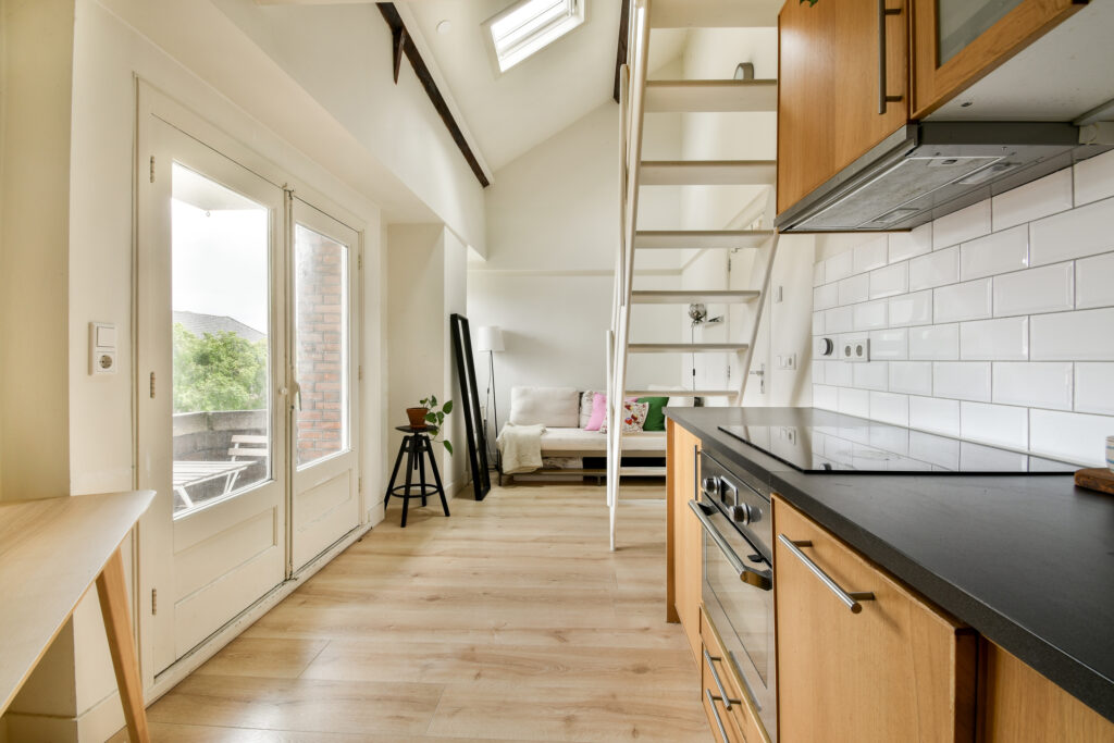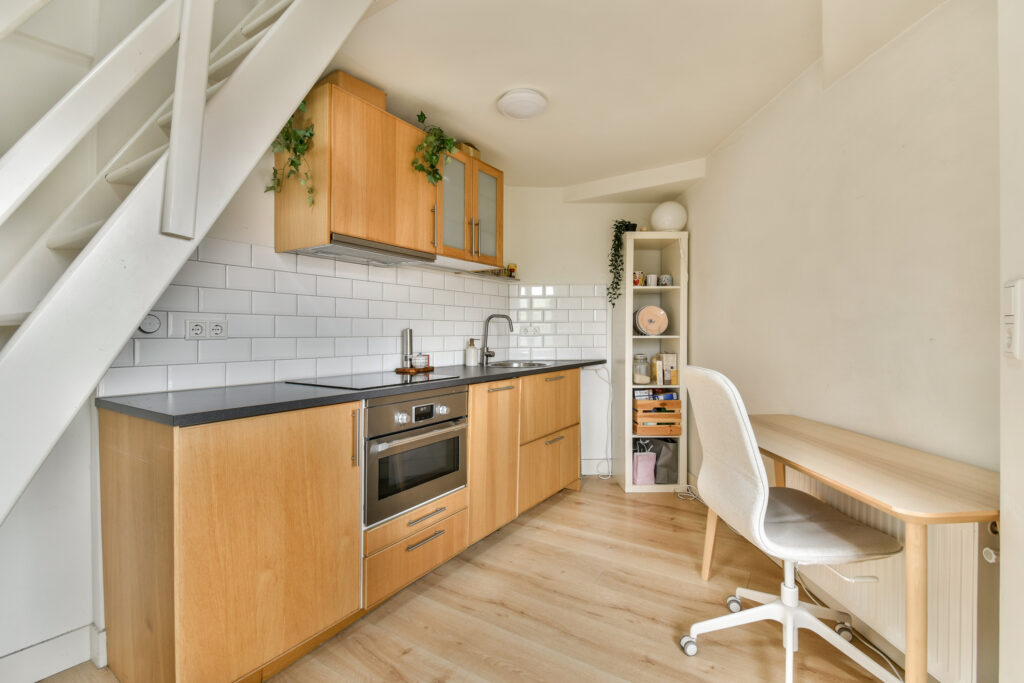 Door maar liefst zes ramen geniet deze woning veel daglicht inval. Er is een open compacte maar functionele keuken gecreëerd met een oven, vaatwasser en inductie kookplaat.
