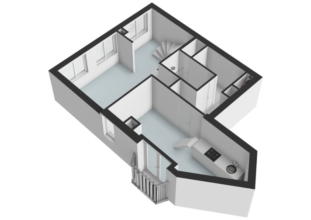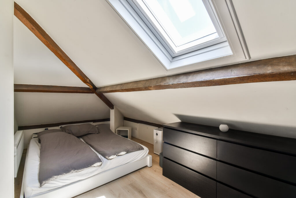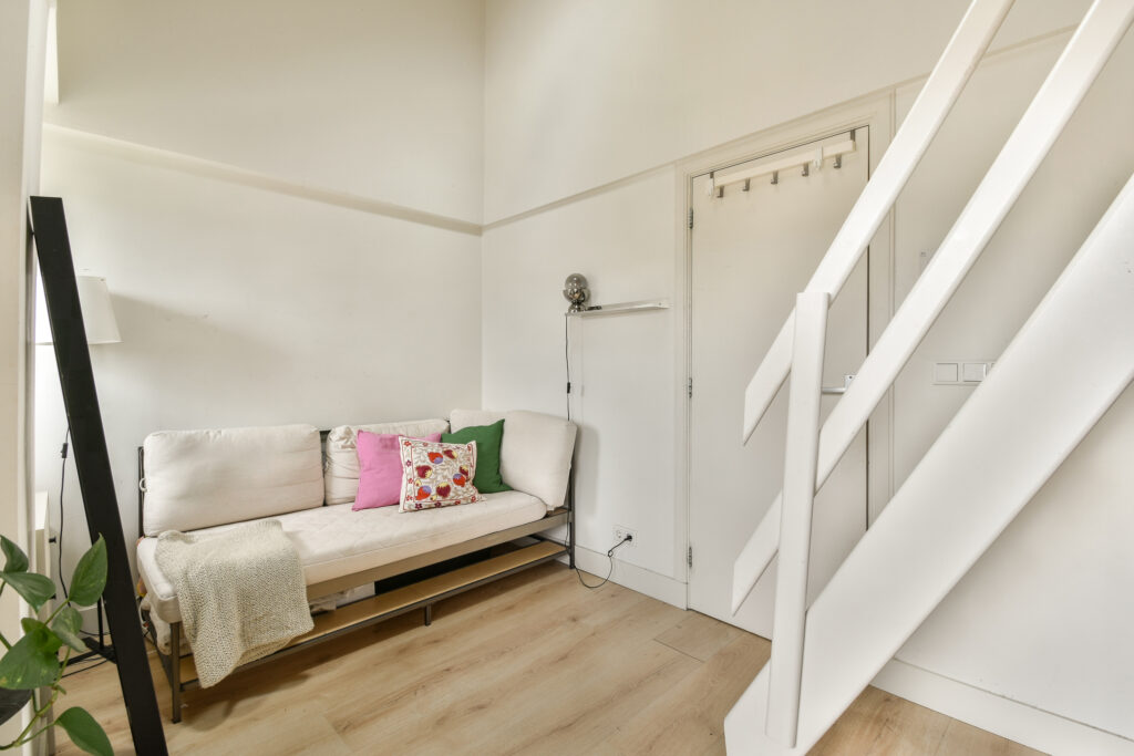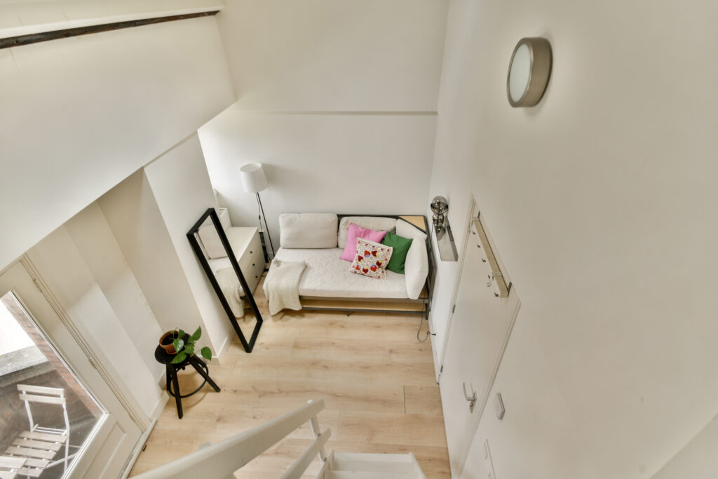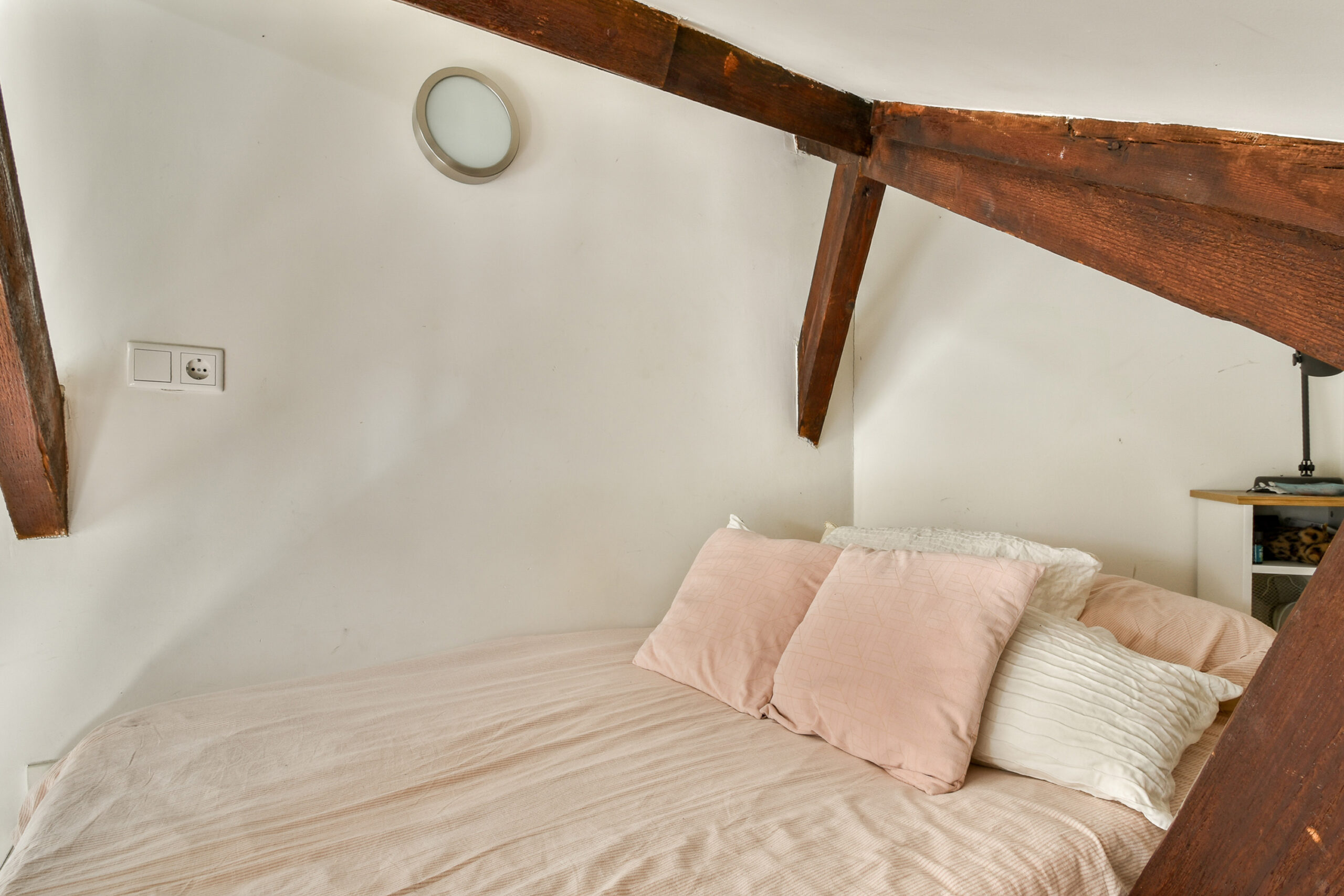 Middels de inpandige trap bereik je de vijfde verdieping waar de slaapkamer én badkamer gelegen zijn.
