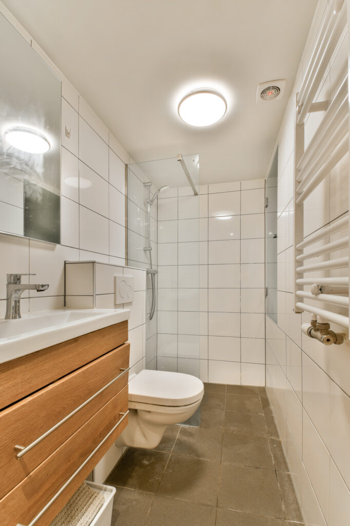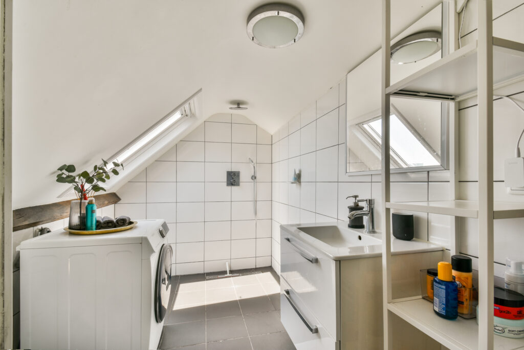 De badkamer van deze woning is gelegen in de hall en beschikt over een wastafel, toilet en douche. Tevens is hier de wasmachine en droog aansluiting aanwezig.
