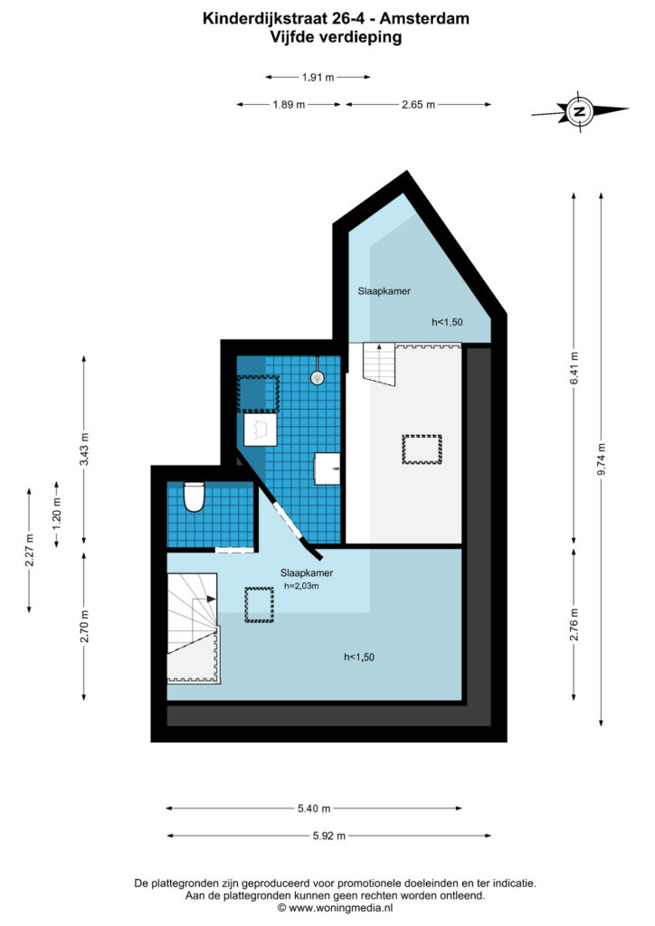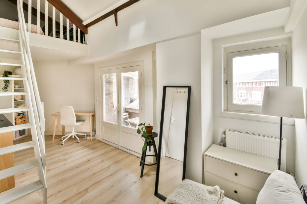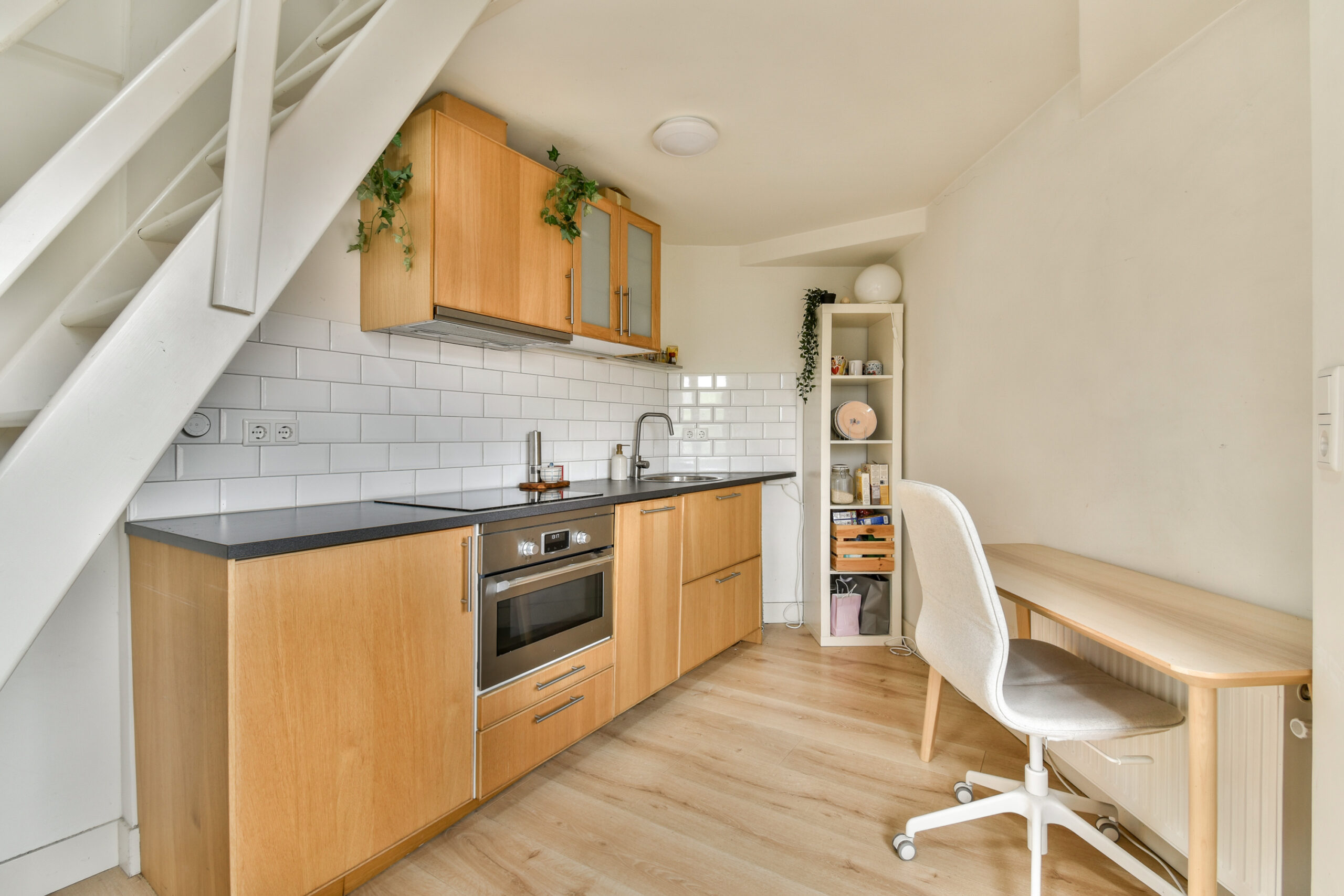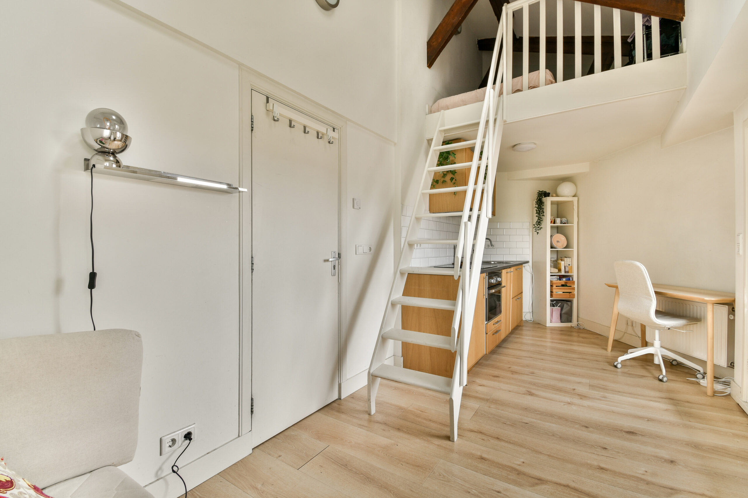 De tweede woning is eveneens slim en compact ingedeeld en heeft toegang middels openslaande deuren tot een balkon op het Noorden welke een open uitzicht geniet. Ook hier is een open keuken gecreëerd met een oven, vaatwasser en inductie kookplaat. Middels de interne trap bereikt u de slaapkamer in de nok.