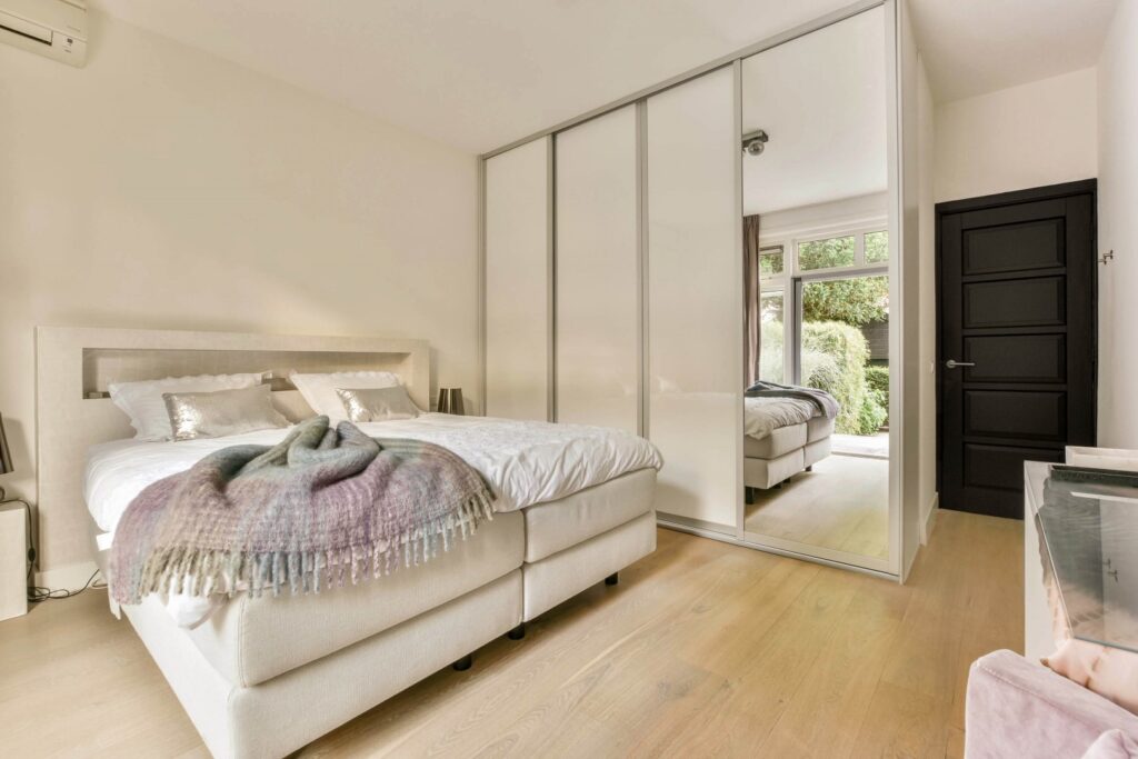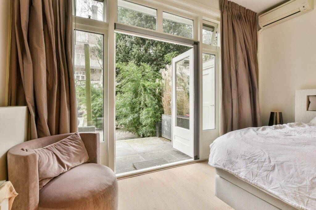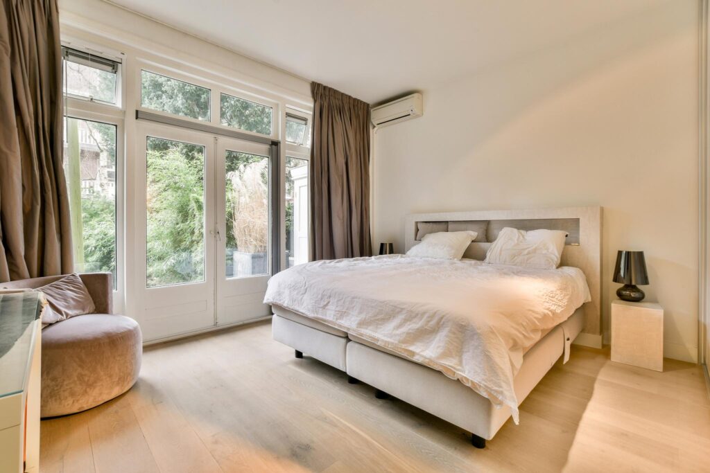 De master bedroom met openslaande deuren naar de tuin heeft airconditioning en veel kastruimte. In de separate walk-in closet staan momenteel de wasmachine en droger en zijn drie grote schoenen kasten gemaakt. Deze kamer kan echter ook prima als slaap- of werkkamer gebruikt worden.
