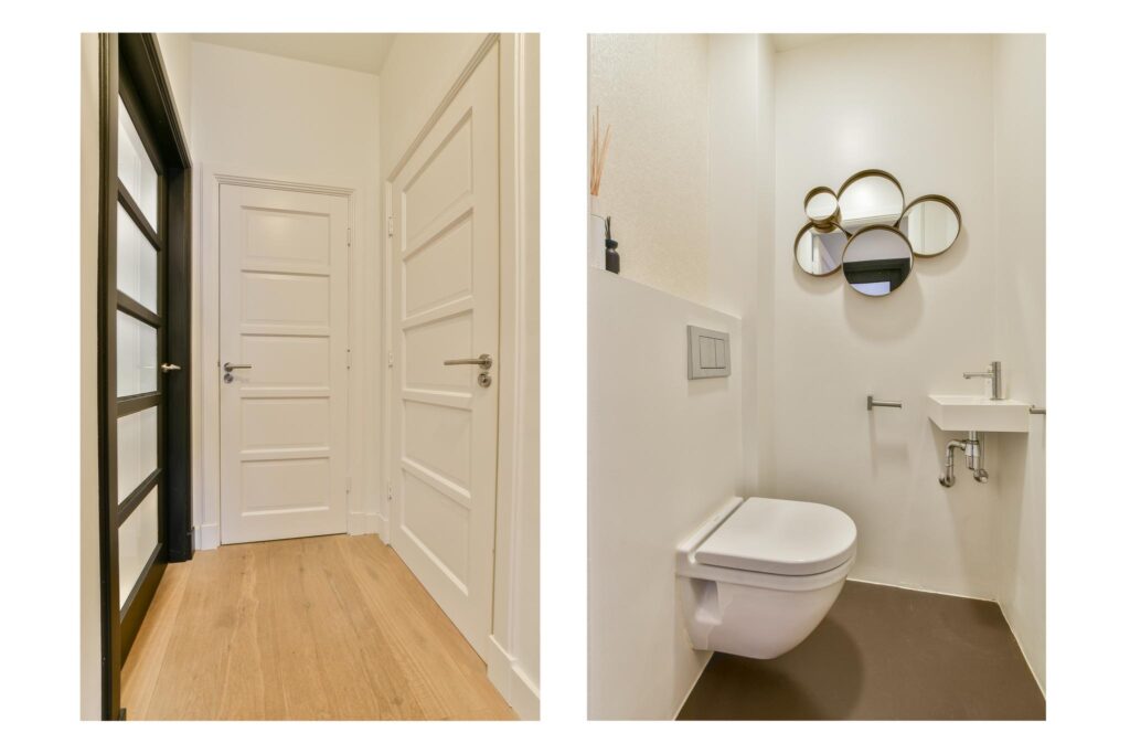 Uiteraard is er een separaat gasten toilet aanwezig. De hele woning is bovendien voorzien van een massief eiken vloer, met uitzondering van de keuken en de badkamer waar vloerverwarming aanwezig is.