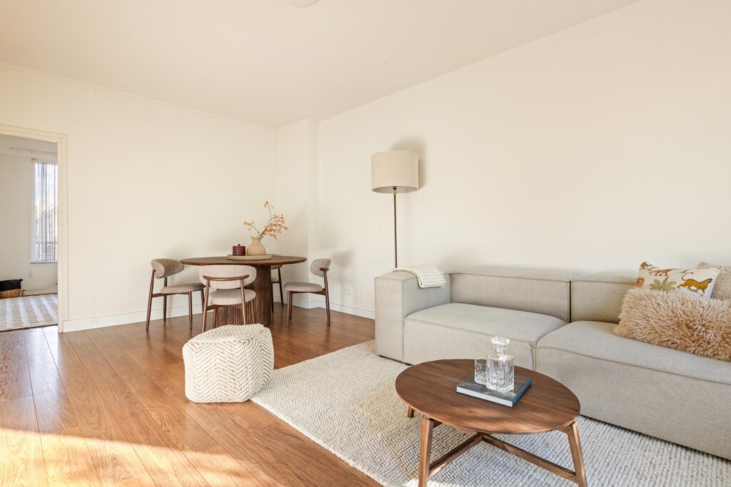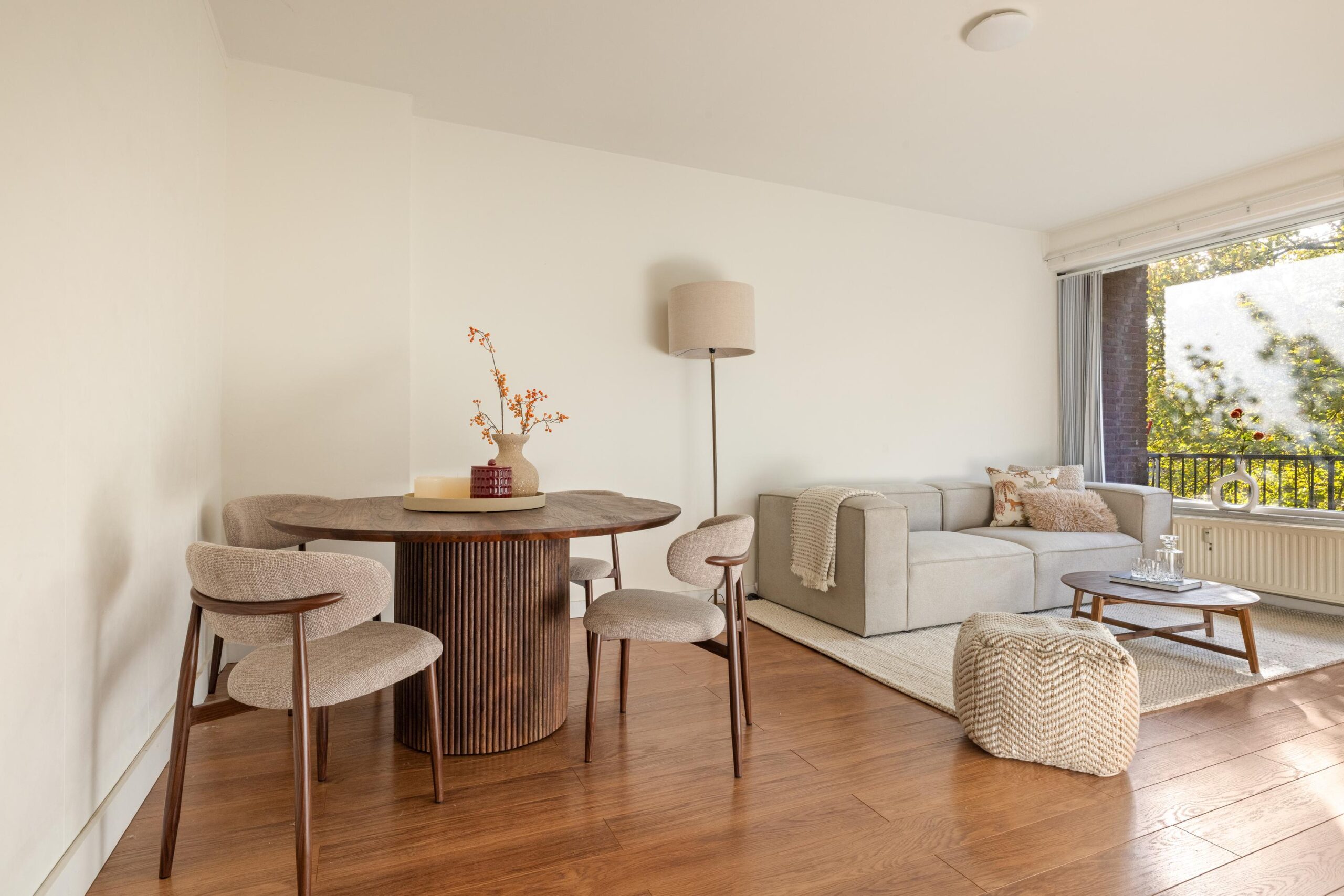 De lichte living met eethoek ligt aan de achterzijde van het appartement. Deze ruimte biedt een prettig uitzicht op groen en dankzij de grote ramen geniet deze veel daglicht inval. Vanuit de living heeft u toegang tot het balkon, welke op het Zuiden gelegen is.