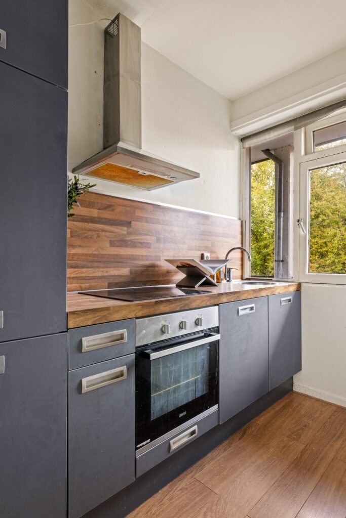 Aan de voorzijde bevindt zich de keuken, voorzien van diverse inbouwapparatuur o.a. oven, koelkast en vriezer, en voldoende kastruimte, o.a. een praktische inbouwkast.