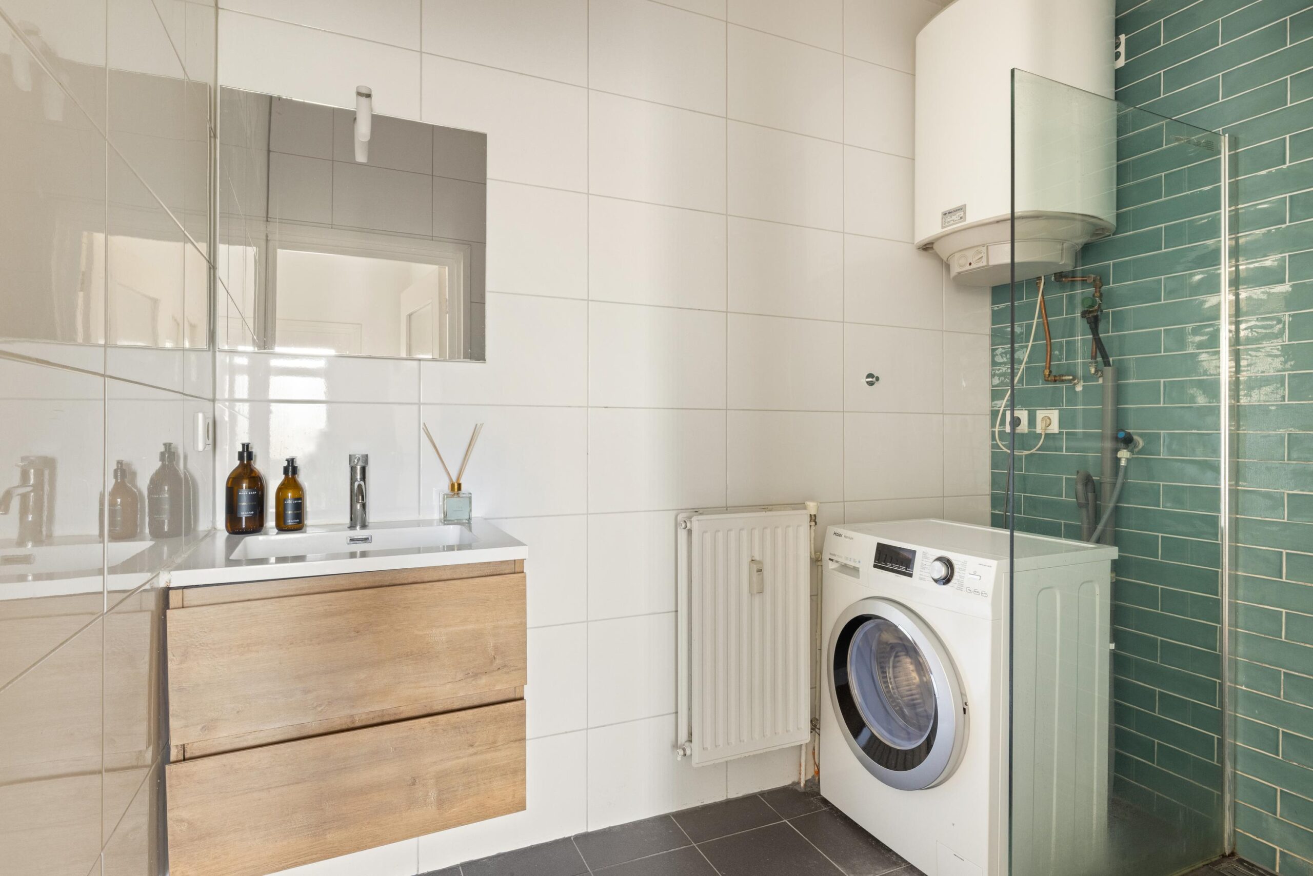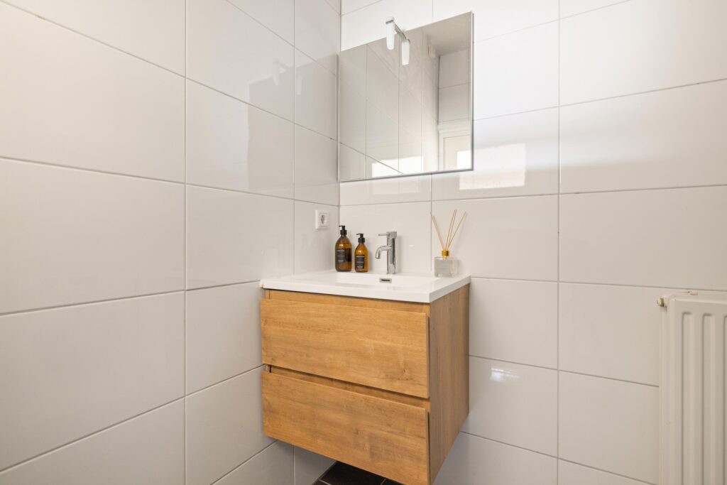 De badkamer is centraal gelegen en voorzien van een douche, wastafel en ook is hier een aansluiting voor de wasmachine.