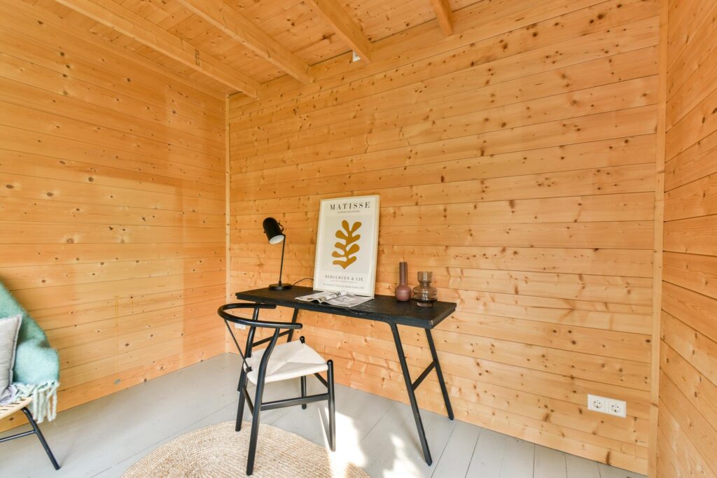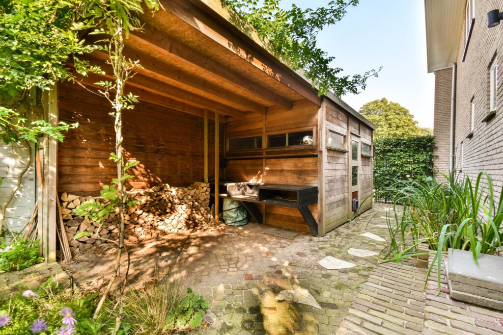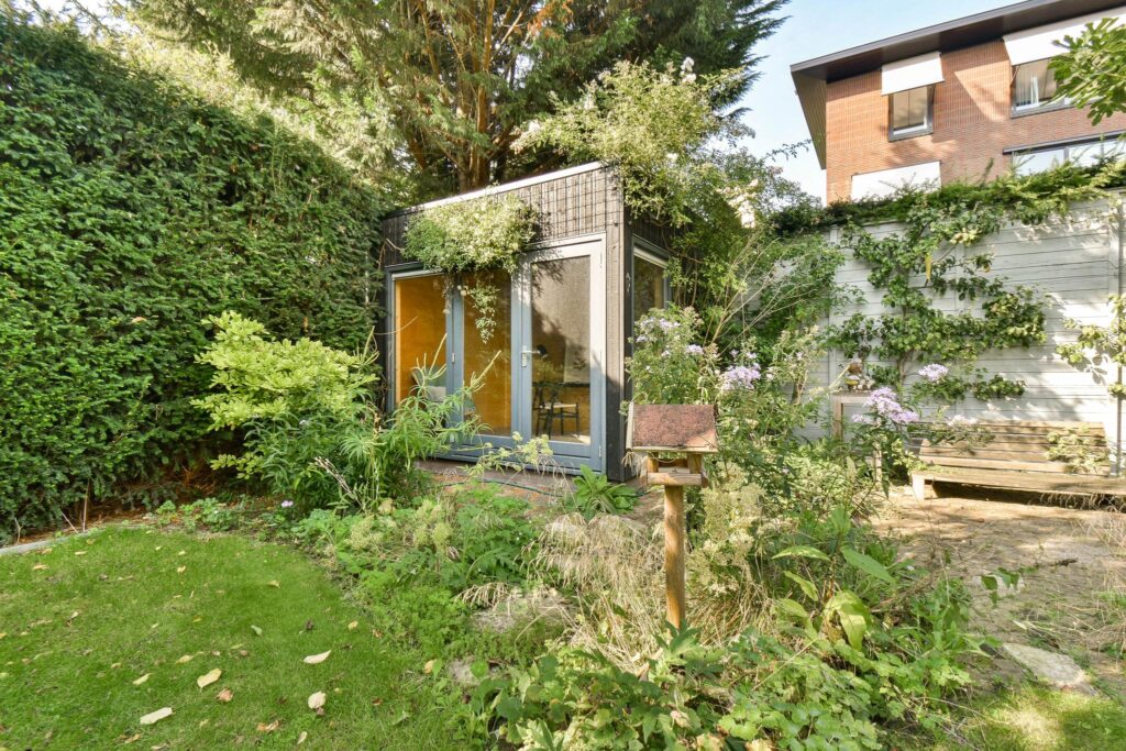 De onder architectuur aangelegde tuin, welke op het Zuid-Westen gelegen is geniet veel privacy. Een gezellige overkapping, een luxe tuinhuis welke in gebruik is als werkruimte én een grote tuinschuur in gebruik als atelier.