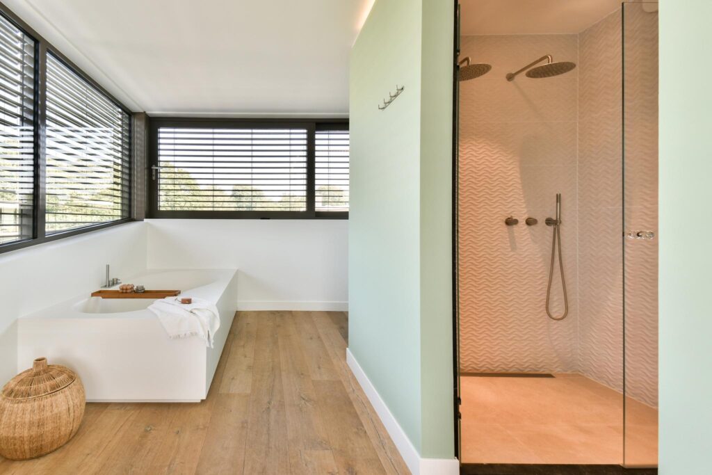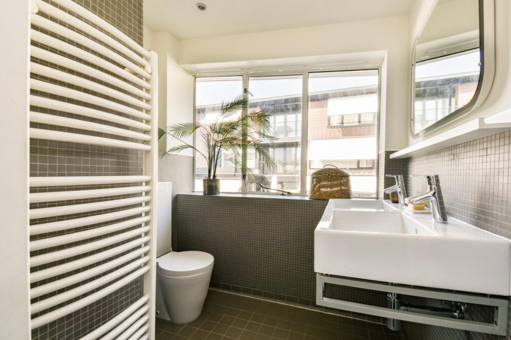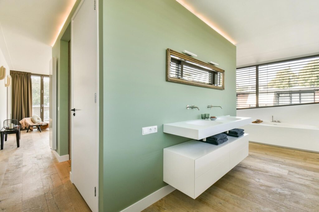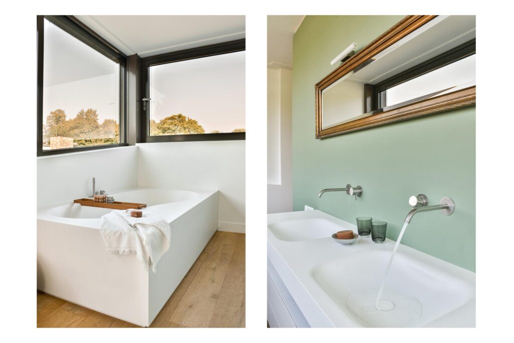 Aan de achterzijde van de kamer is een walk-in closet en luxe badkamer gelegen, deze beschikt over een dubbele douche, dubbele wastafel, wc én op maat gemaakt ligbad. De badkamer is dusdanig doordacht gerealiseerd, dat het de mogelijkheid biedt ’s morgens bij het klaarmaken voor de dag, de stad tot leven te zien komen en de zon zien opkomen.