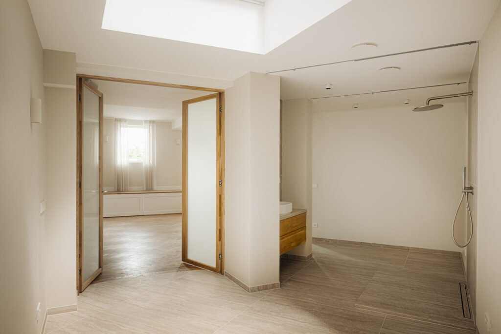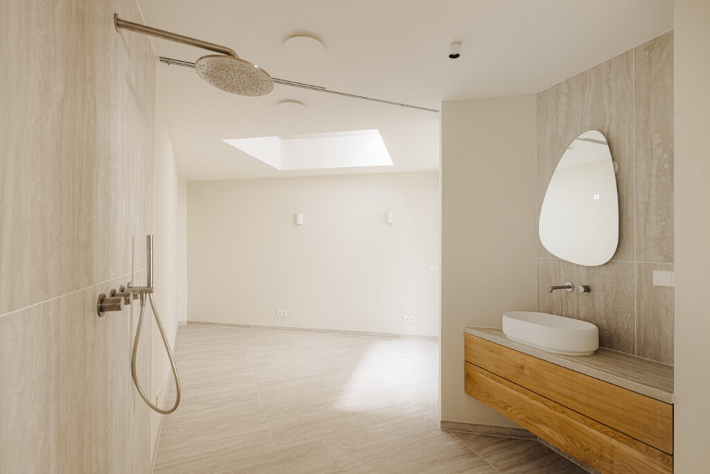 In de hoek van het appartement ligt de slaapkamer. De slaapkamer heeft een dakvenster en is verbonden met een luxe badkamer met uiterst strak design.