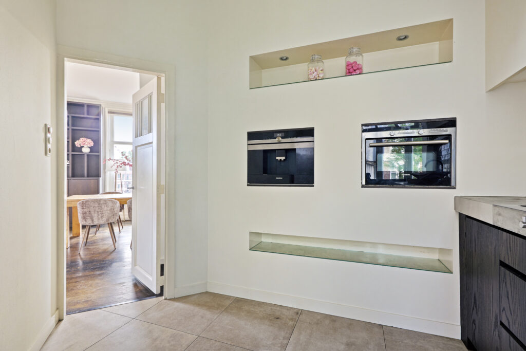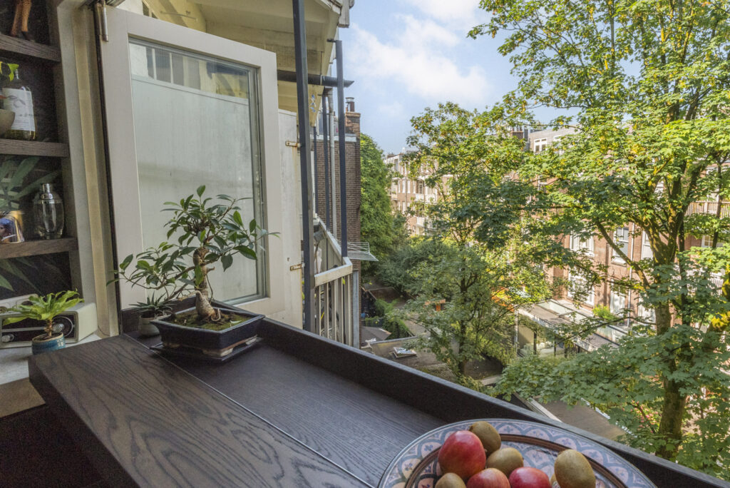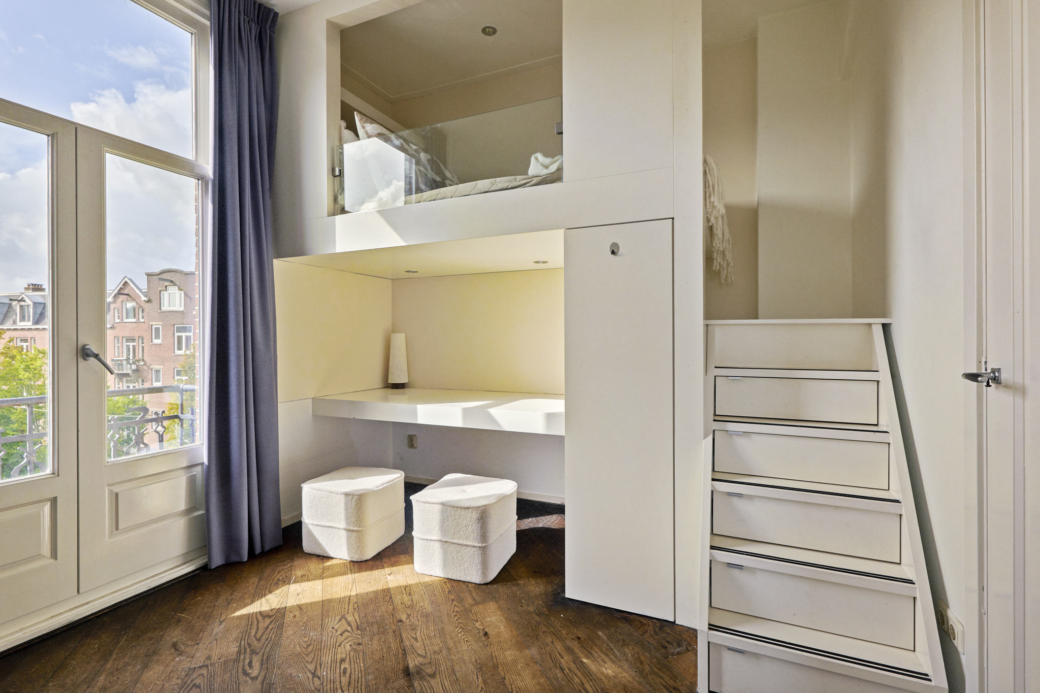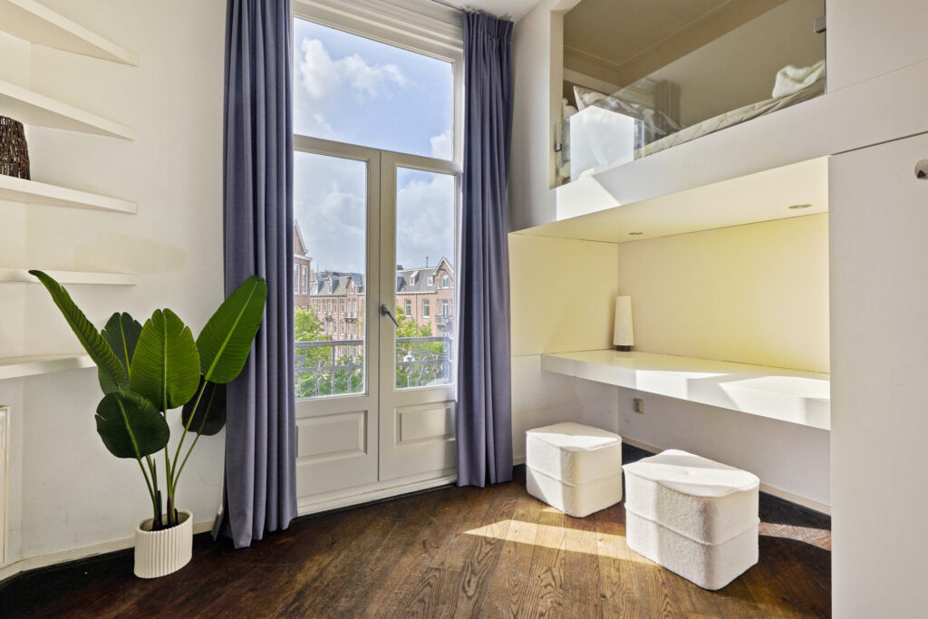 Middels de hal heeft u directe toegang tot de riante lichte woonruimte gelegen aan de voorzijde met hoge plafonds, een zitgedeelte en een eetkamer. Door de vele ramen is er veel daglicht en middels de openslaande deuren naar het terras een weids uitzicht over de Sophialaan/Amstelveenseweg. De riante keuken gelegen aan de achterzijde is van alle denkbare inbouwapparatuur voorzien, o.a. een vijf-pits gasfornuis, vaatwasser, combi magnetron/oven en een koffiemachine van het merk Siemens. De keuken heeft eveneens grote ramen welke helemaal opengezet kunnen worden, waardoor het lijkt of het een inpandig balkon betreft. Middels een verstelbare bar kunt u hier de zon zien opkomen en heeft uitzicht op het groen van de binnentuin. Tevens is een slaapkamer gelegen aan de voorzijde van de woning en beschikt over een ingebouwde hoogslaper, bureau, airco en heeft toegang tot een balkon. Er is een tweede kamer aan de achterzijde, welke momenteel in gebruik is als study en geniet een grote ingebouwde werktafel, deze kamer is simpel om te toveren tot extra slaapkamer.