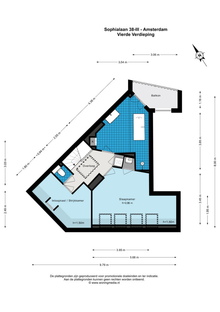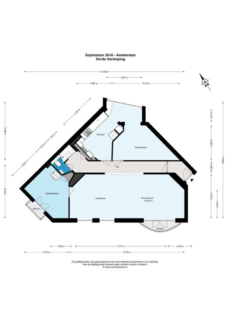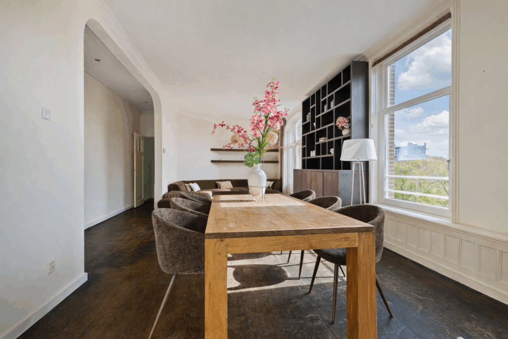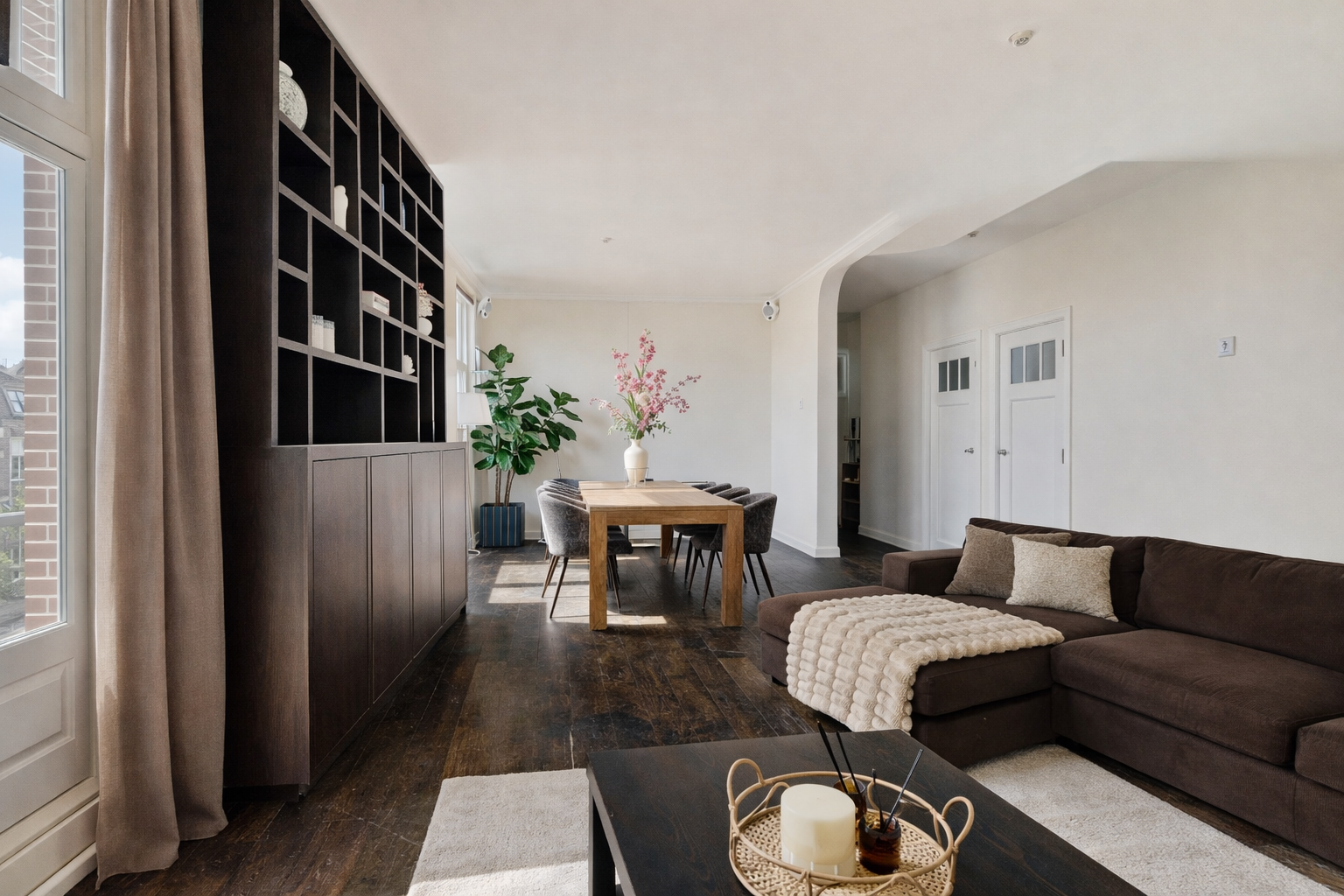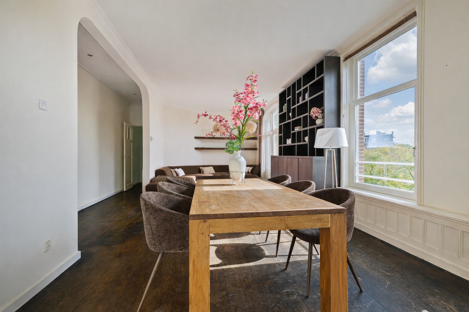 TE KOOP: Sophialaan 38-III, appartement gelegen op de twee bovenste verdiepingen ad 133M2, beschikt over een lichte living, hoge plafonds, woonkeuken, 2 slaapkamers, kleed/strijkkamer, werkkamer ook te gebruiken als derde slaapkamer en meerdere balkons/terras met vrij uitzicht over de Sophialaan/Amstelveensweg.