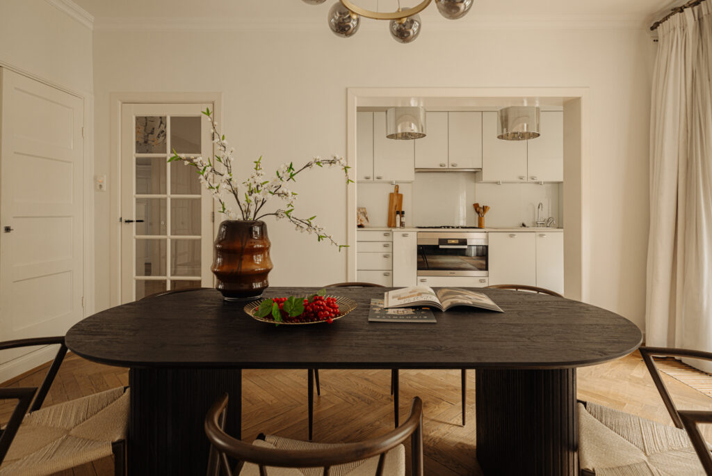 De royale living met eetgedeelte vormt het hart van de woning en staat in directe verbinding met de open keuken.