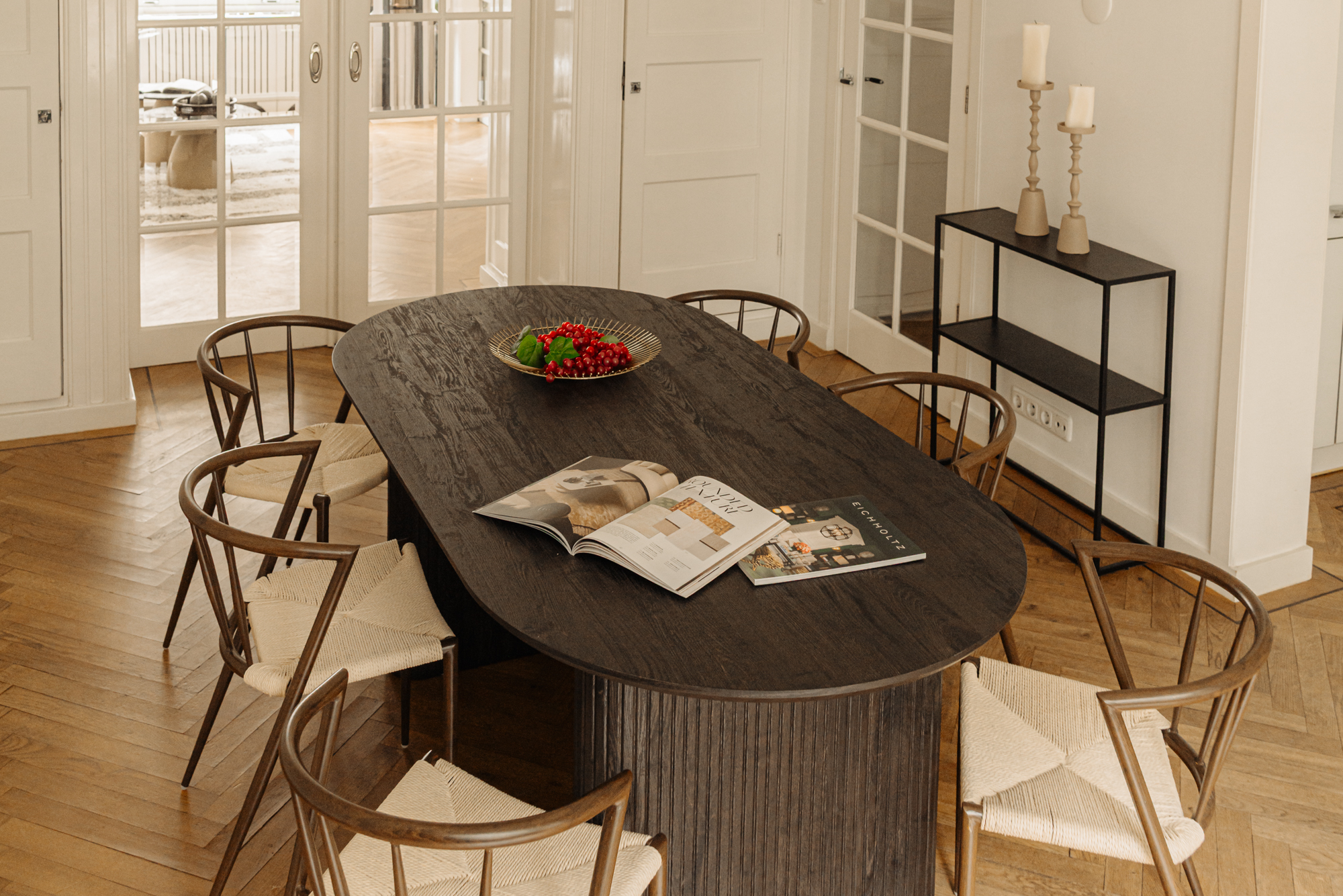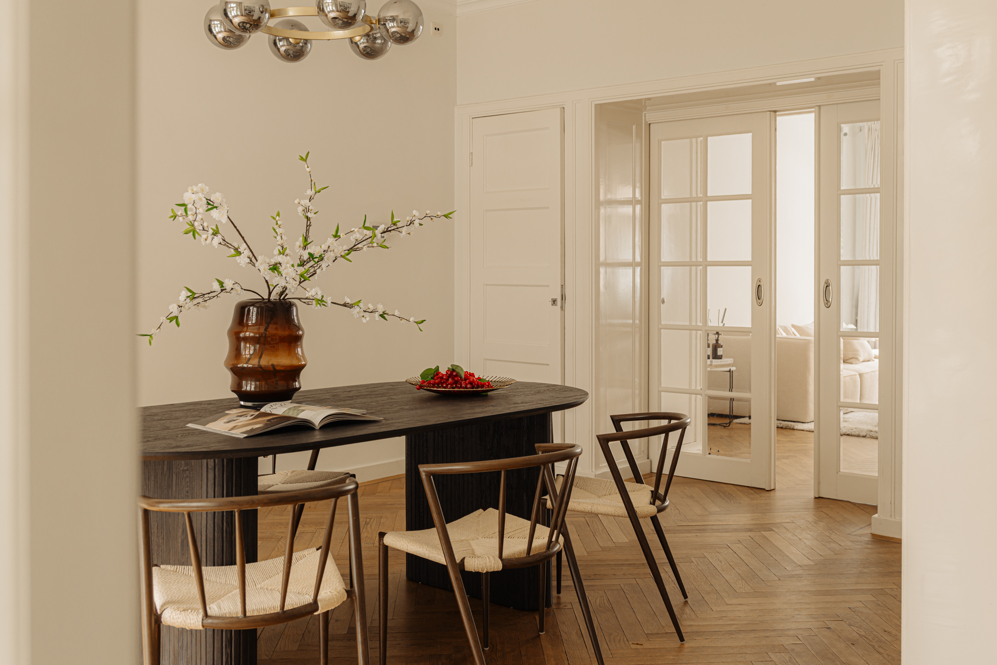 The spacious living room with dining area forms the heart of the property and is directly connected to the open kitchen.