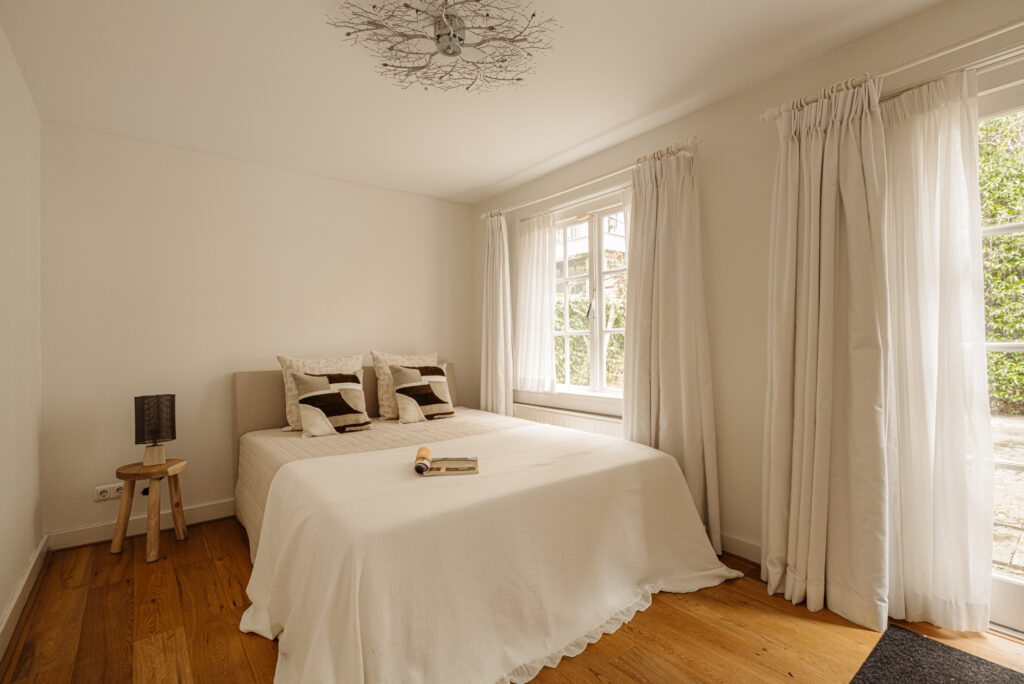 Via de hal bereikt u de zeer ruime hoofdslaapkamer aan de achterzijde. Deze biedt directe toegang tot de fraai aangelegde tuin op het Zuiden. Ook vanuit de living is de tuin bereikbaar, waardoor binnen en buiten op natuurlijke wijze in elkaar overlopen.