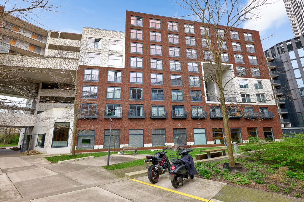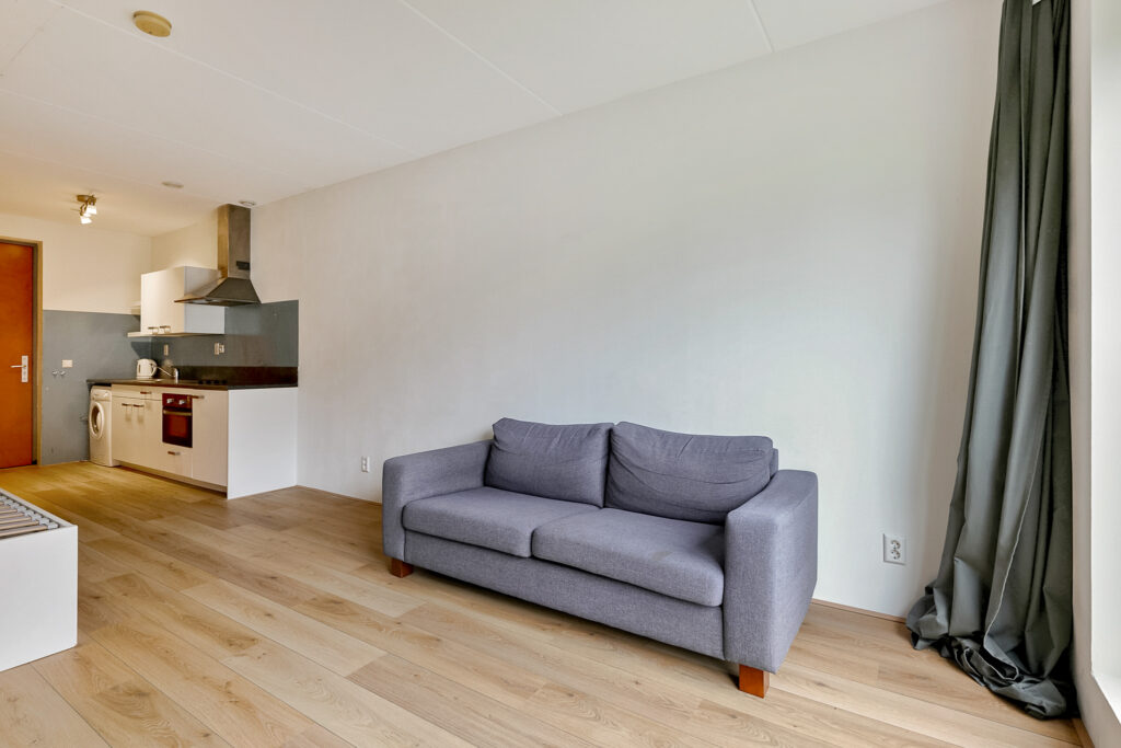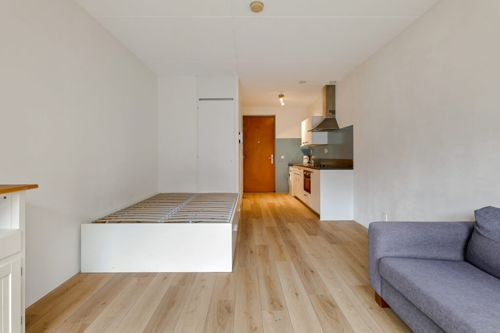 Centrale hal met liften, trappenhuis en brievenbussen. De studio is gelegen op de derde verdieping. Op de galerij is een groot gemeenschappelijk terras met meubilair. Je komt de woning binnen in de nette open keuken, voorzien van diverse inbouwapparatuur zoals een koelkast met vriesvak, inductie kookplaat, afzuigkap, combi-oven en wasmachine.